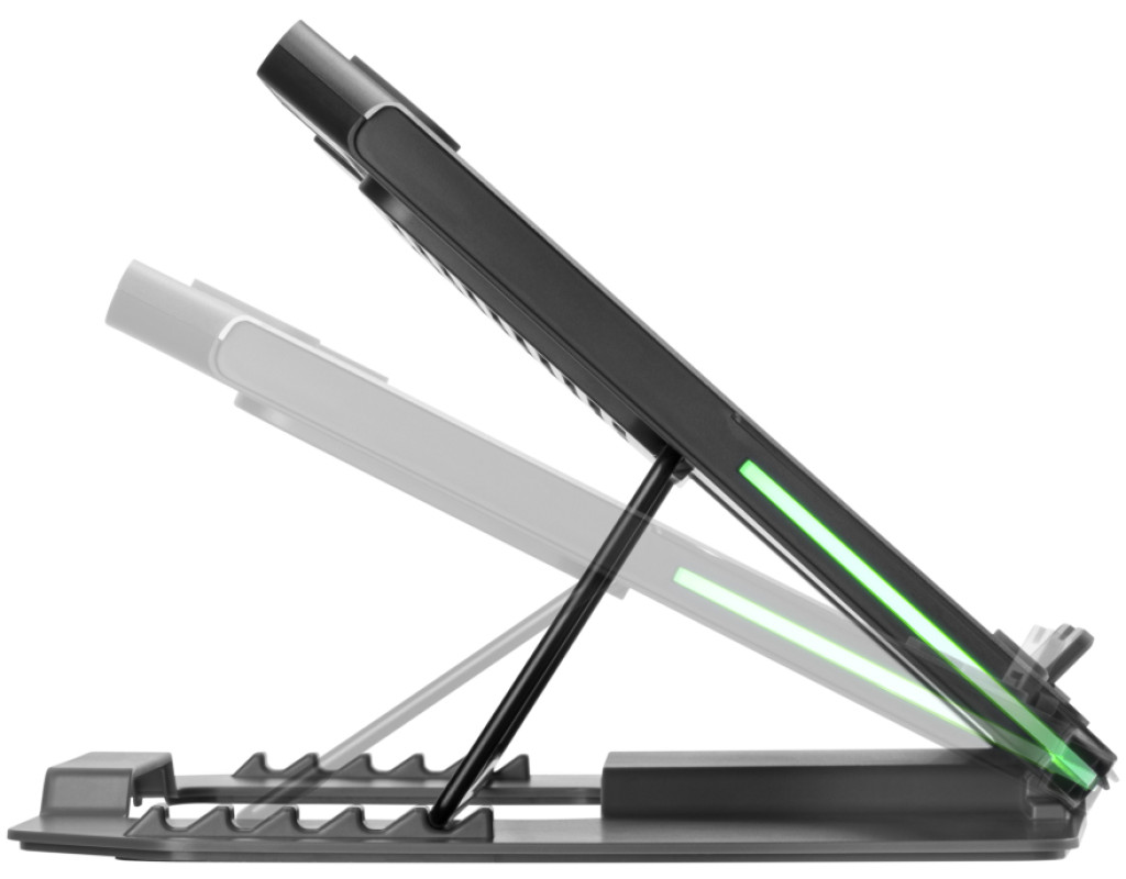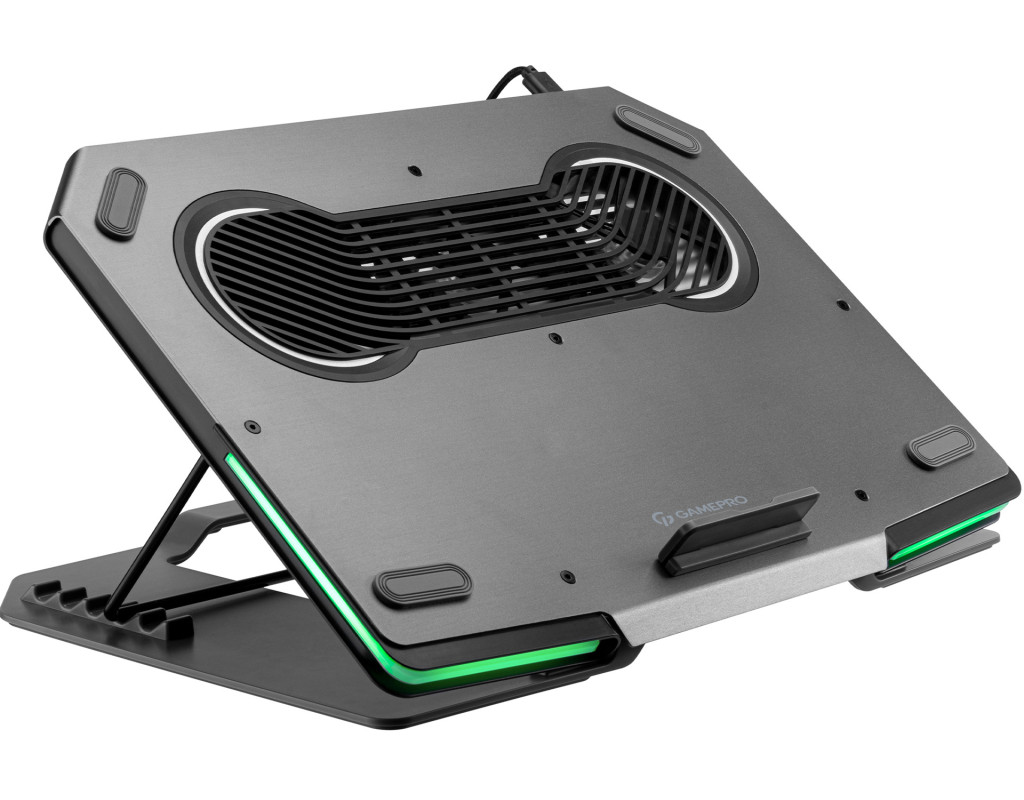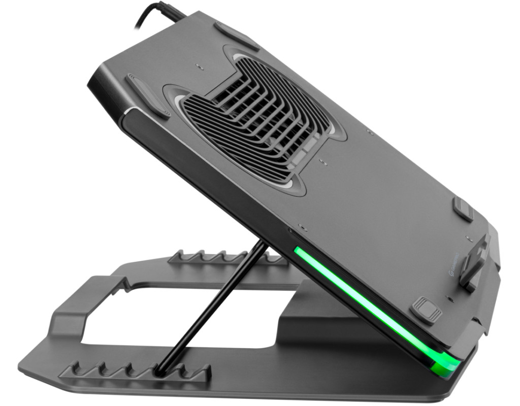 Охолоджуюча підставка для ігрового ноутбука CP1540, включає RGB-підсвічування з динамічними світловими ефектами. Завдяки 3 вентиляторам охолодження підставка забезпечує всебічний захист від тепла максимум для 17-дюймових ігрових ноутбуків вагою до 5 кг. 5-рівневе регулювання висоти знімає всю втому під час довгих годин гри. 1 USB-порт також включений для додаткової ігрової периферії підключення.