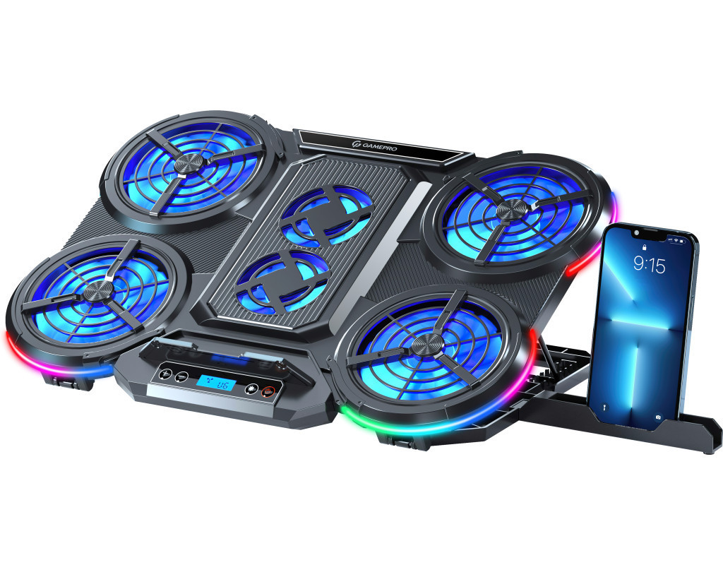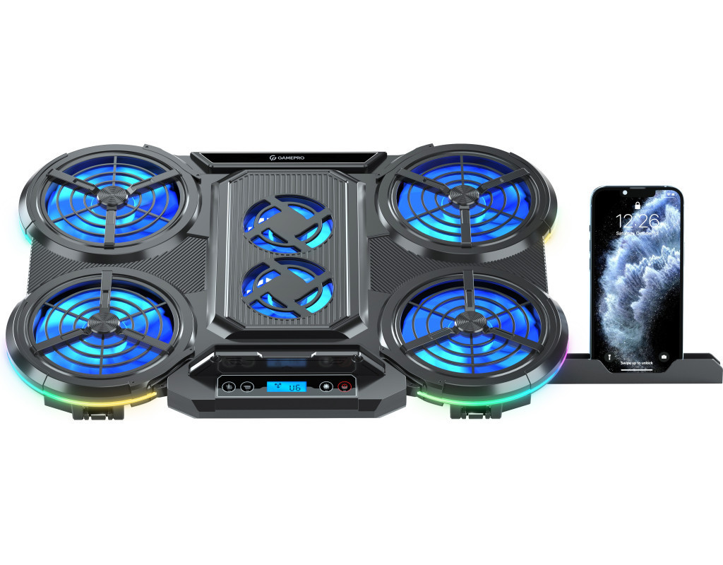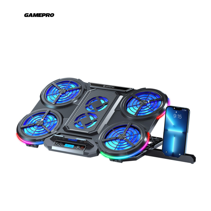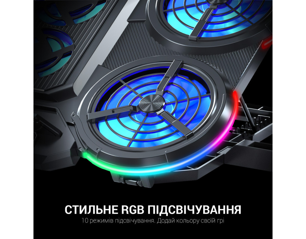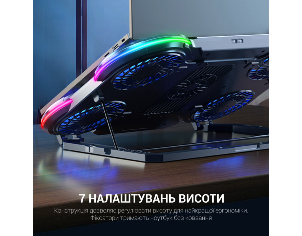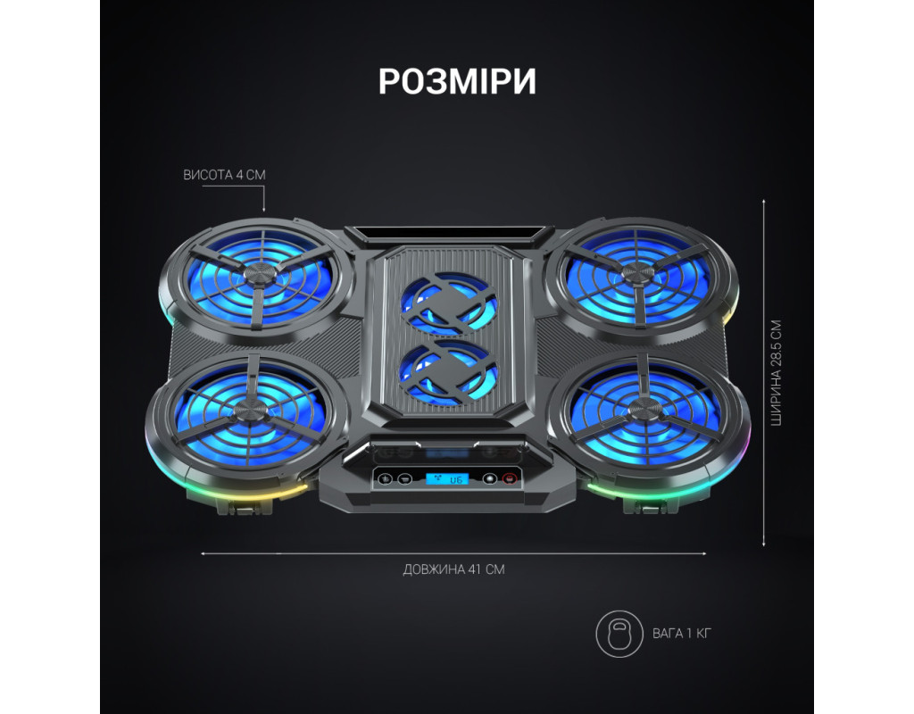Наший продукт також оснащений LCD-дисплеєм, який відображає інформацію про температуру, щоб ви завжди мали під контролем роботу системи охолодження. Додатковим бонусом є тримач для смартфона, який робить цю підставку не тільки функціональною, але й практичною для вас.