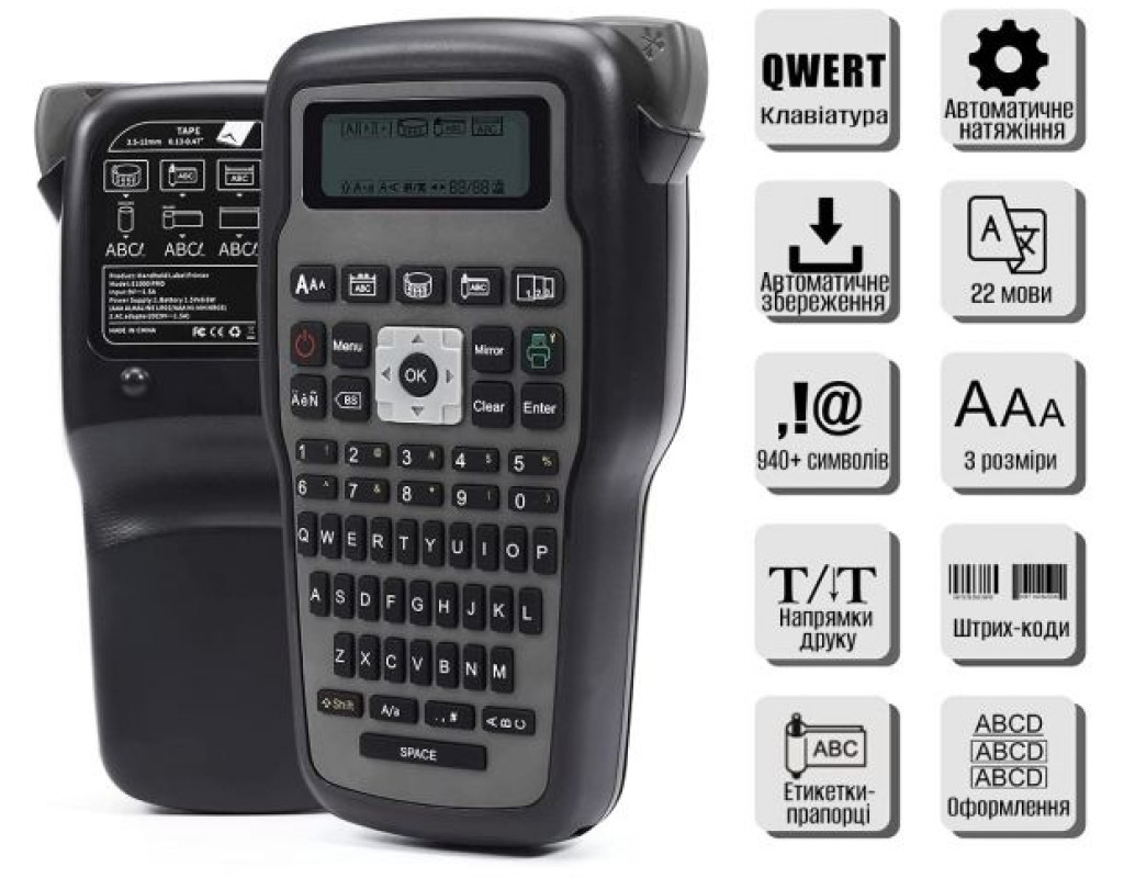 Модель: Ukrmark E1000 Pro GR Колір: сірий Метод друку: термотрансферний Клавіатура: QWERTY Ширини етикетки: 6 / 9 / 12 мм Роздільна здатність: 180dpi Швидкість друку: 20 мм/с Рядків друку: макс.4 рядки Символи: 940+ Друк штрих-кодів: підтримує Підтримує мови: 22 мови Автозбереження Розміри шрифтів: 3 (Великий, Середній, Маленький) Різак: ручний Сфери застосування: Телекомунікації, енергетика, лікарні, лабораторії, будівництво, промисловість, офіс, приватне використання Види живлення: 1) мережевий блок живлення (в комплекті); 2) 6-батарейок типу ААА(не входять до комплекту) Розмір виробу: 116*58*212 мм Ваг: 0,95 кг Комплект поставки: - Принтер етикеток Ukrmark E1000 PRO Gray; - Блок живлення; - Картридж UKRMARK B-T231P, ламінована стрічка, 12мм х 8м. Чорним на білому; - Інструкція |