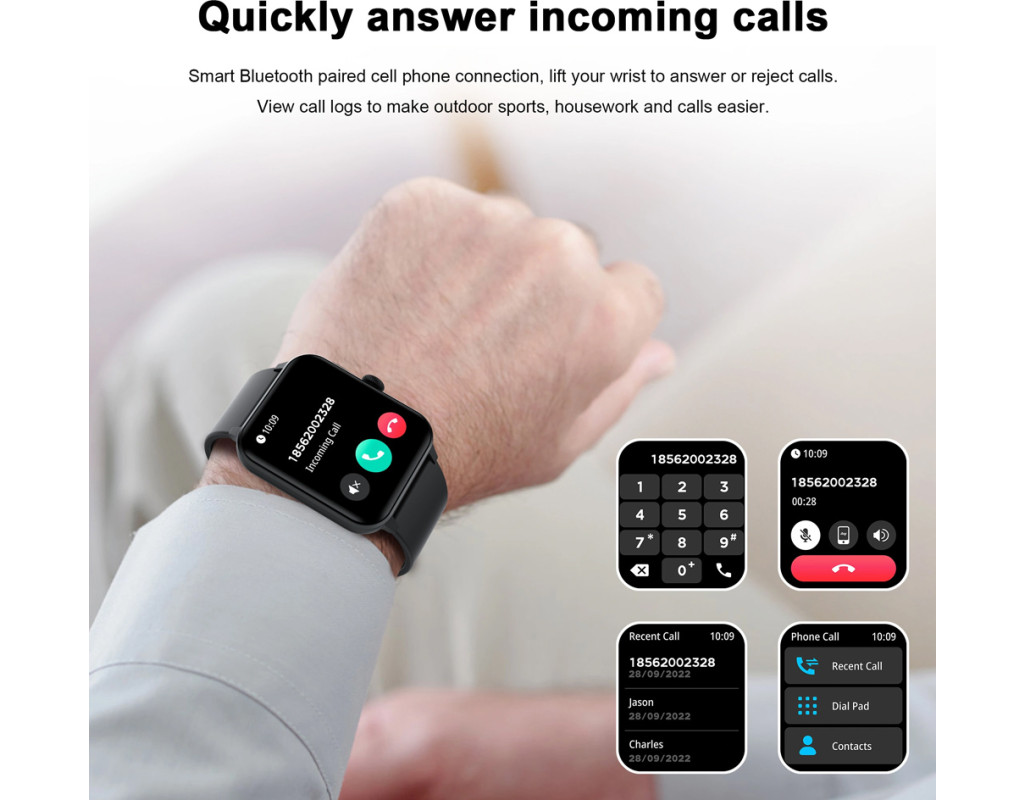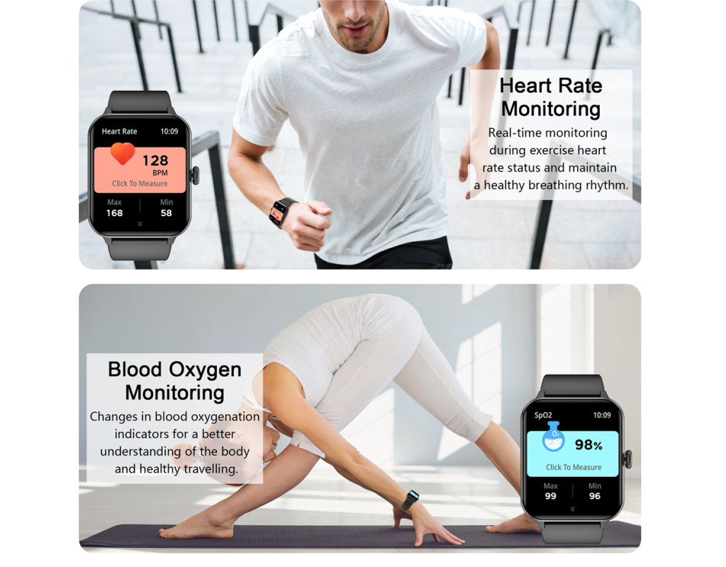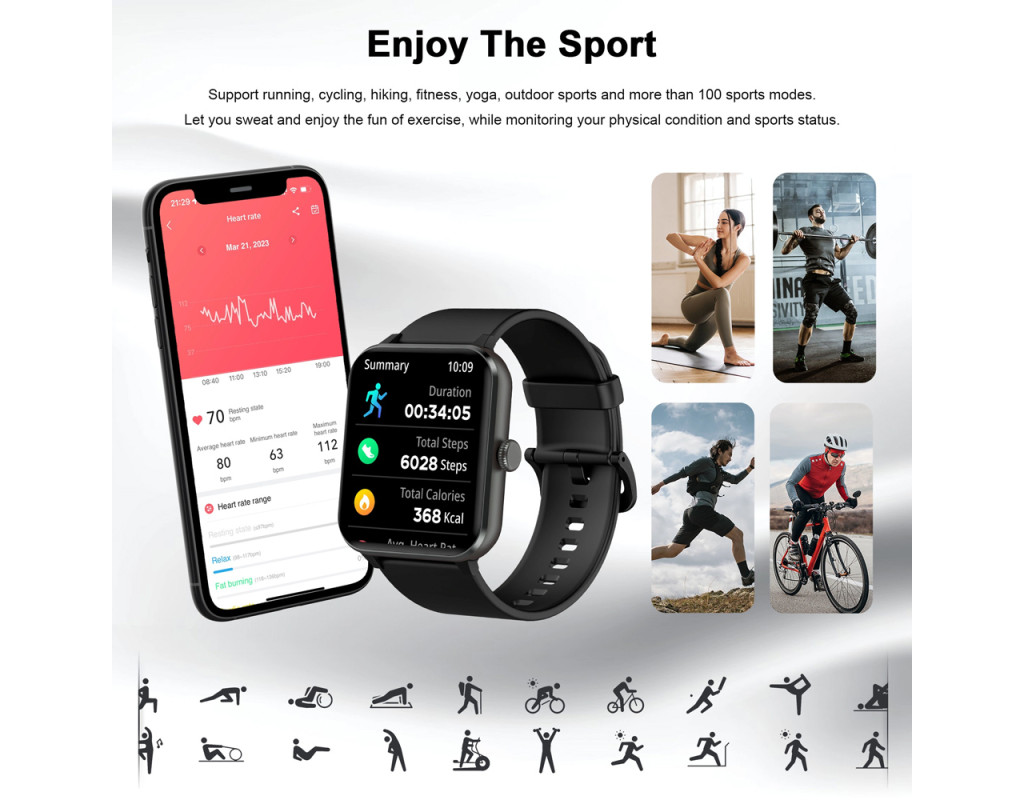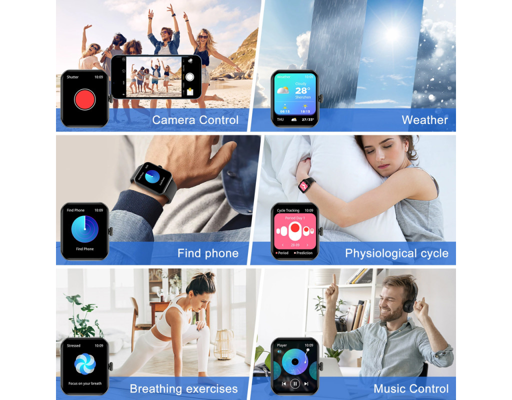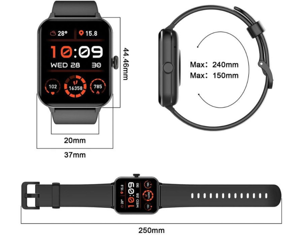 Акселерометр, 25 спортивних режимів, мікрофон, вібромотор, керування камерою та музикою, регулювання яскравості, захист за стандартам IP68, магнітна зарядка, функція гучного зв'язку, контроль денної активності, трекінг сну, пульсометр, рівень кисню у кров |