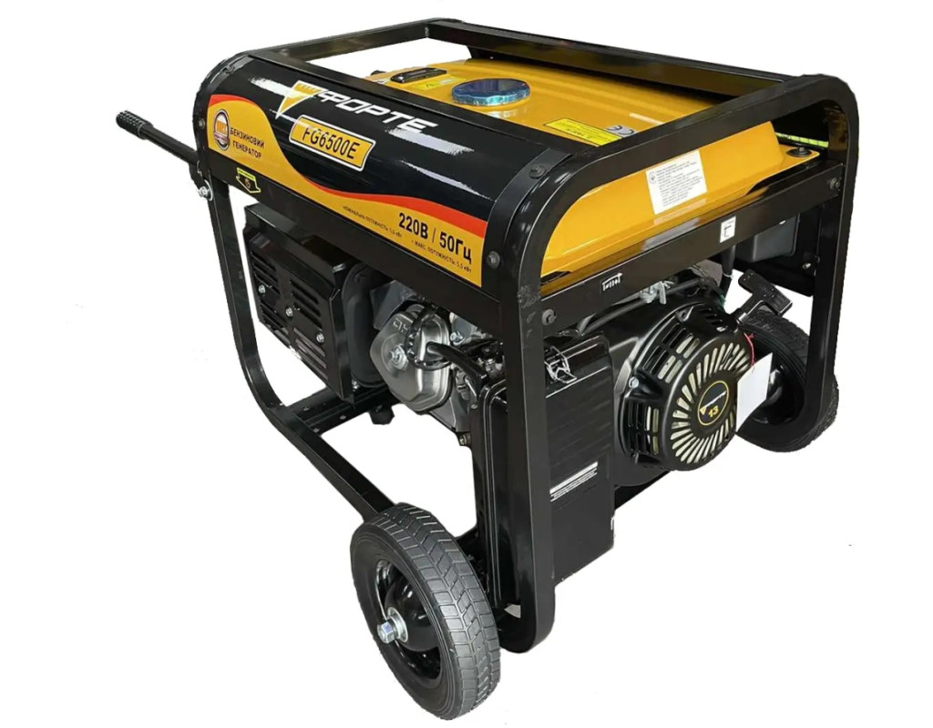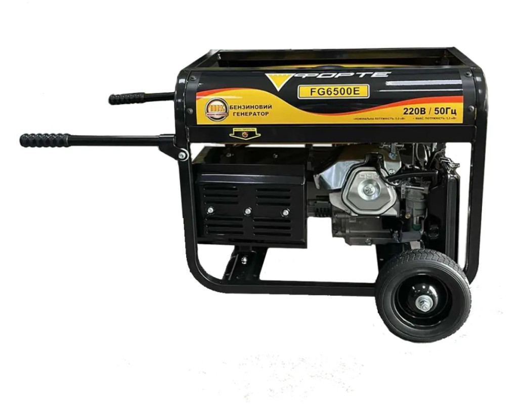 Однофазний бензиновий генератор Forte FG6500E — відмінний вибір професійного апарату для забезпечення електроживленням Вашого будинку, електроприладів, різних видів приміщень, складів, і малих підприємств. Апарат найчастіше використовується як аварійне джерело живлення в місцях де бувають часті перебої з електропостачанням чи ні електрики зовсім. Генератор відмінно себе показав при тривалій і короткочасній роботі як в жарку, так і в холодну пору року. Тому дані технічні особливості однофазної бензинової електростанції Forte FG6500E зробили її популярною серед домовласників, дачників, комунальників, будівельних бригад, які працюють на виїзді. Генератор оснащений потужним 4-х тактним бензиновим двигуном, ємним паливним баком в 25 л, електростартером, посиленою рамою, а також наявністю ряду захистів для запобігання поломок або перегріву апарату. Однофазний бензиновий генератор Forte FG6500E досить економно витрачає паливо (споживає 0,55 л / кВт-год), а його безперервна робота може тривати до 11-ти годин (за умови повної заправки і навантаження генератора). Особливості: