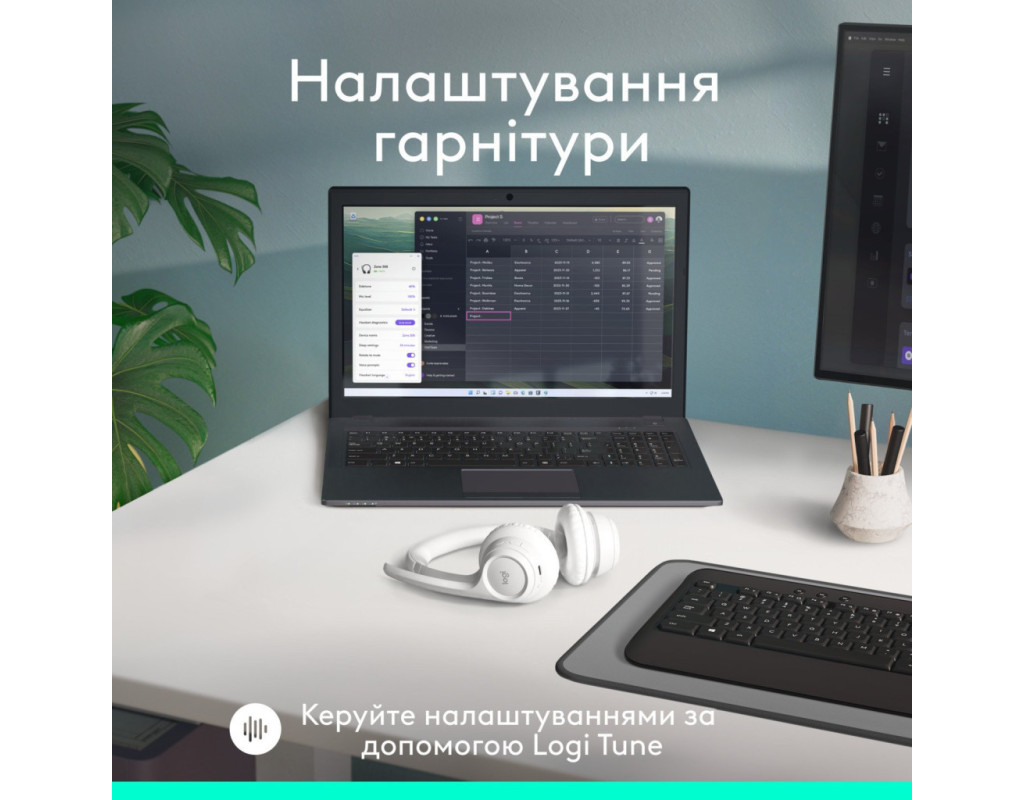 Налаштування в LOGI TUNE Налаштуйте гарнітуру Logitech під себе: налаштуйте прошивку вашої гарнітури за допомогою безкоштовного додатка Logi Tune; завантажте додаток, щоб налаштувати фільтрацію фонового звуку, рівень гучності мікрофона та еквалайзер для чіткого звучання.