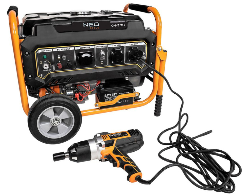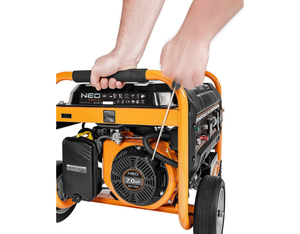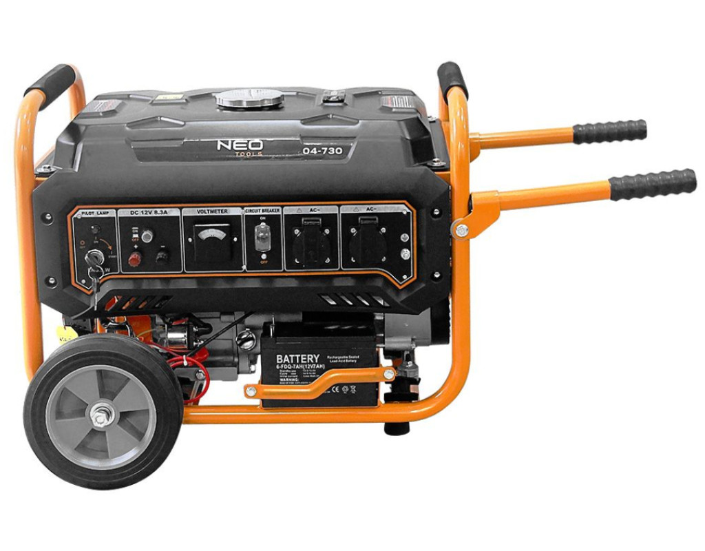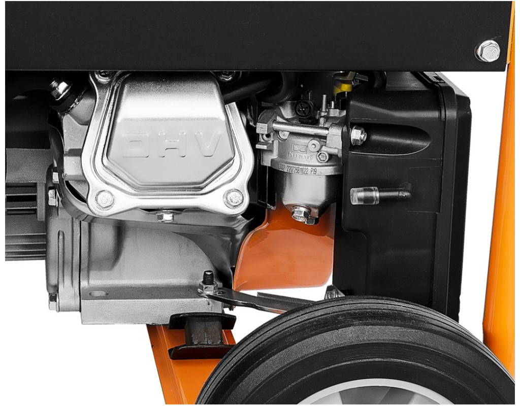Бензиновий генератор Neo Tools, 04-730, 2.8/3.0кВт Компактний, мобільний і солідний генератор максимальною потужністю 3 кВт (номінальна 2.8 кВт) дає змогу живити електроприлади в місцях без доступу до мережі. Використовується як автономне живлення для електроприладів, зокрема чутливої електроніки, комп'ютерів, побутової техніки тощо. Запускається за допомогою вимикача запалювання і оснащений чотиритактним бензиновим двигуном потужністю 5,1 кВт / 8,16 к.с. Рекомендовані види палива: 92, 95 і 98 та олива SAE-15W-30. Агрегат має бак ємністю 15 л і маслобак для двигуна - 0,6 л. Середня витрата пального у цієї моделі становить 2,63 л/год, а мінімальна витрата пального - 313 г/кВтг. Агрегат відповідає стандарту ЄВРО 5 із серії європейських норм викидів. Він також має захист AVR, тобто систему, що ефективно стабілізує напругу у вихідній розетці та захист від перевантаження за струмом. Завдяки їм він забезпечує перевантажувальну безпеку для себе та інших під'єднаних до нього пристроїв. Генератор посилено захисною рамою, яка не тільки полегшує транспортування, а також колеса і ручки, а й захищає всю конструкцію від механічних пошкоджень. |