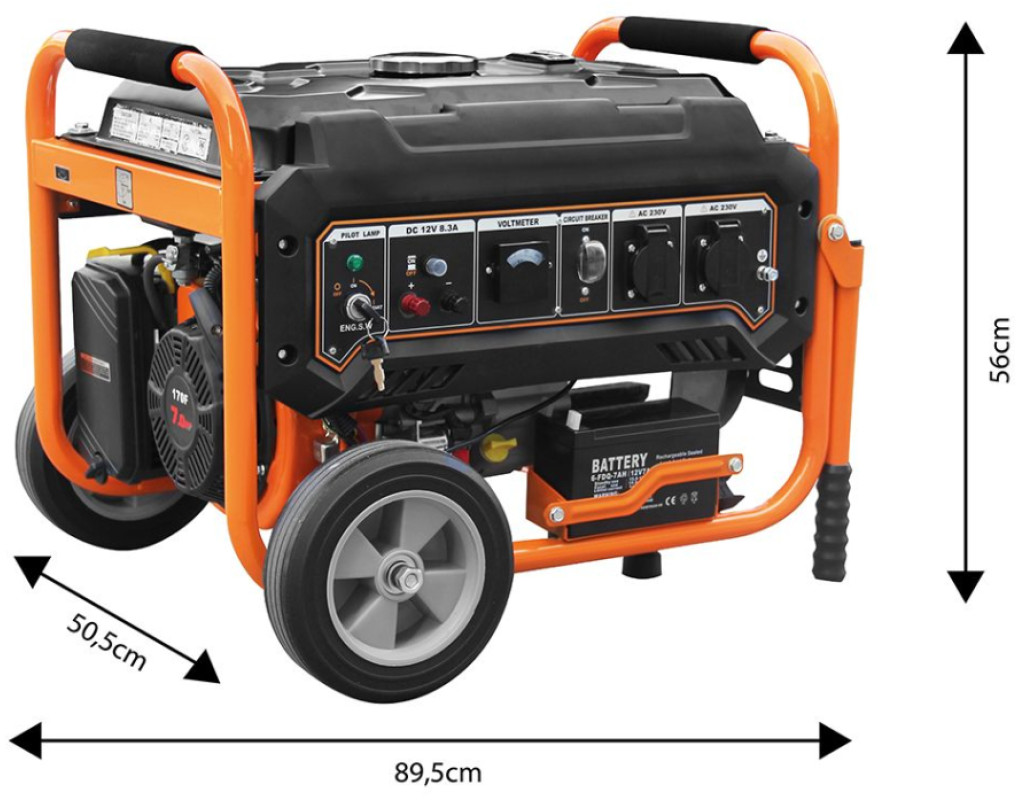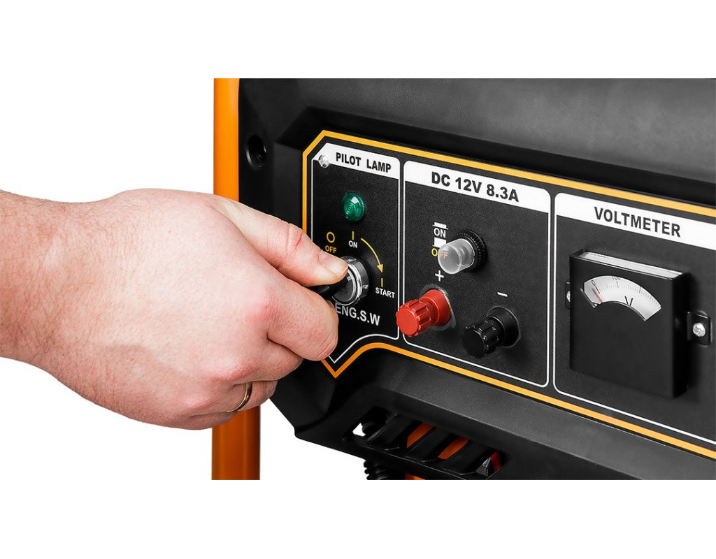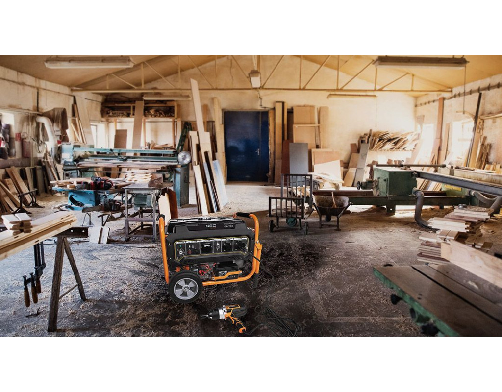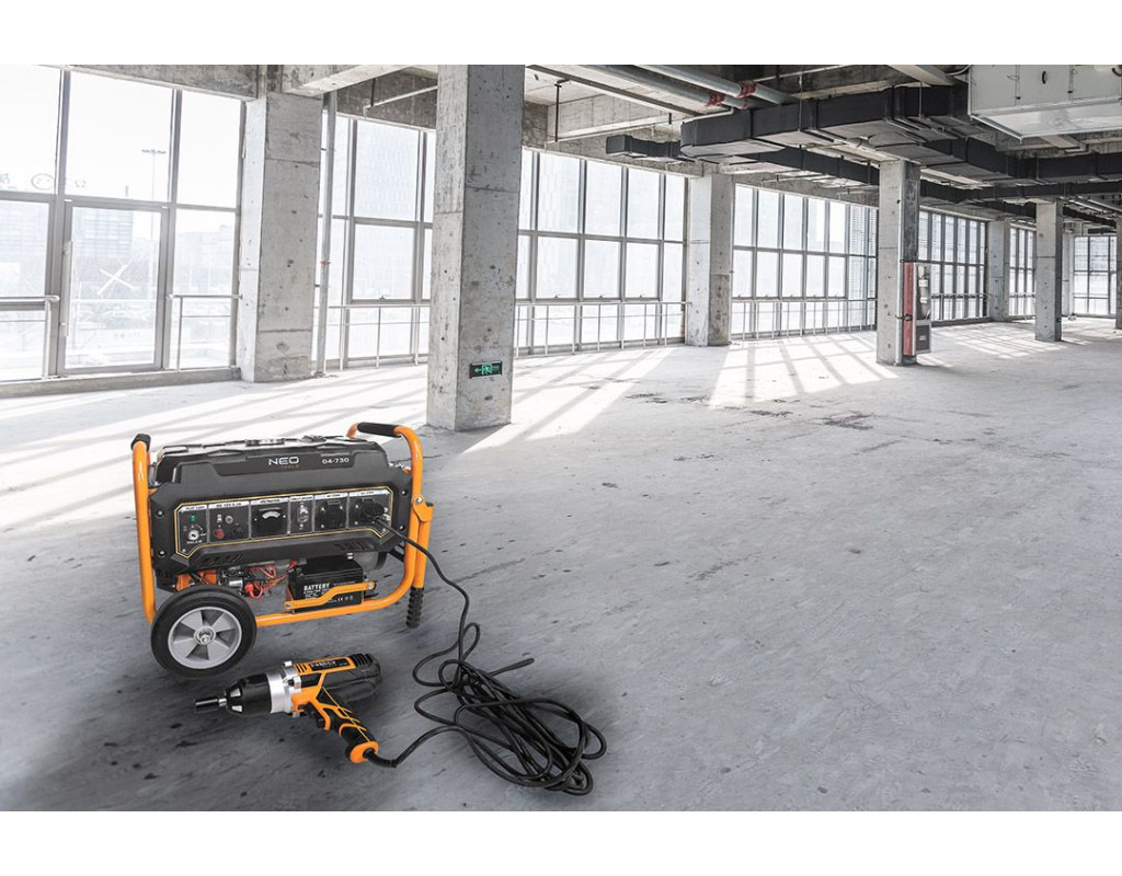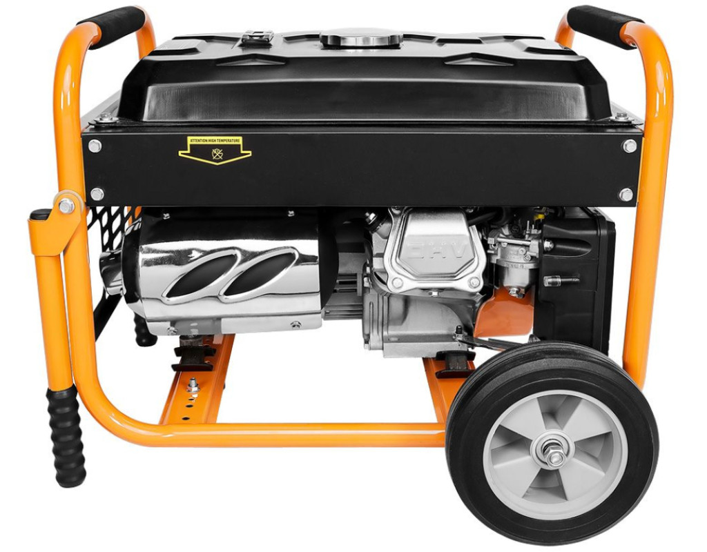 Бензиновий генератор Neo Tools, 04-730, 2.8/3.0кВт Компактний, мобільний і солідний генератор максимальною потужністю 3 кВт (номінальна 2.8 кВт) дає змогу живити електроприлади в місцях без доступу до мережі. Використовується як автономне живлення для електроприладів, зокрема чутливої електроніки, комп'ютерів, побутової техніки тощо. Запускається за допомогою вимикача запалювання і оснащений чотиритактним бензиновим двигуном потужністю 5,1 кВт / 8,16 к.с. Рекомендовані види палива: 92, 95 і 98 та олива SAE-15W-30. Агрегат має бак ємністю 15 л і маслобак для двигуна - 0,6 л. Середня витрата пального у цієї моделі становить 2,63 л/год, а мінімальна витрата пального - 313 г/кВтг. Агрегат відповідає стандарту ЄВРО 5 із серії європейських норм викидів. Він також має захист AVR, тобто систему, що ефективно стабілізує напругу у вихідній розетці та захист від перевантаження за струмом. Завдяки їм він забезпечує перевантажувальну безпеку для себе та інших під'єднаних до нього пристроїв. Генератор посилено захисною рамою, яка не тільки полегшує транспортування, а також колеса і ручки, а й захищає всю конструкцію від механічних пошкоджень. |