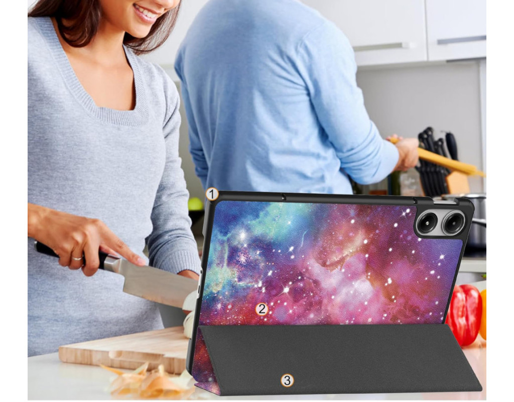 Завдяки конструкції "обкладинка", чохол міцно фіксується на планшеті та легко відкривається. Він також виконує функцію підставки, що дозволяє зручно розташувати пристрій у декількох положеннях для перегляду відео, читання чи роботи.