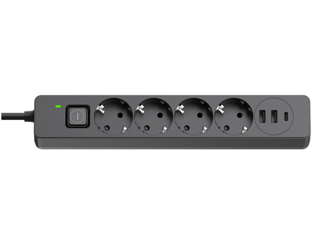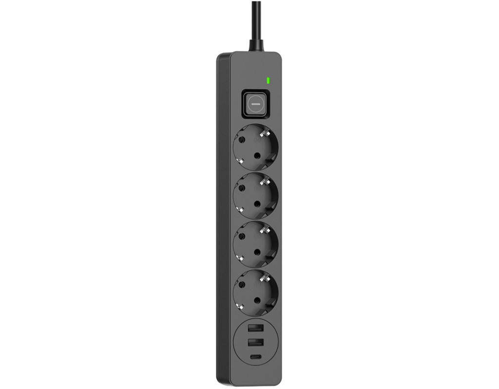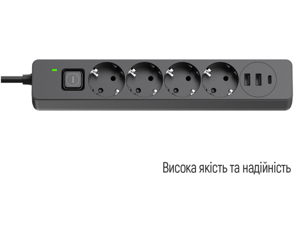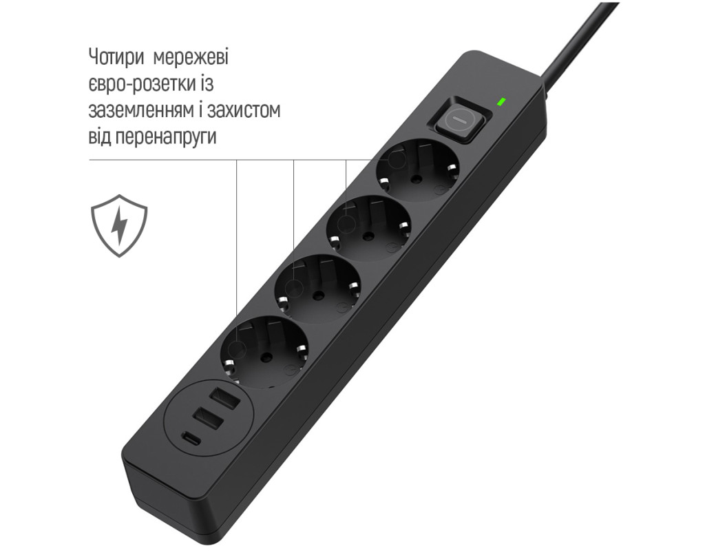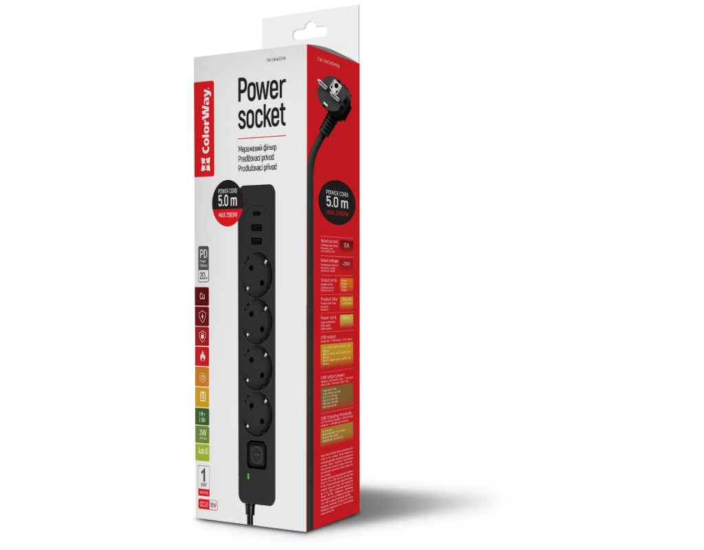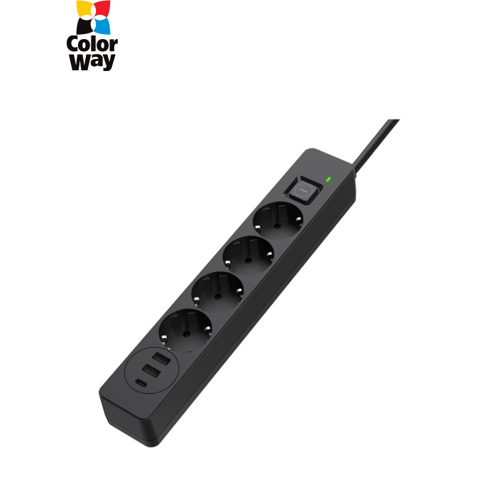 Мережевий фільтр ColorWay CW-CHE435PDB містить чотири мережеві розетки 220В і три USB-порти. Захисні шторки на розетках забезпечують безпеку використання, а автоматичний розподіл енергії між USB-портами забезпечує ефективну зарядку пристроїв (до 24Вт). Два USB-порти підтримують швидку зарядку Quick Charge 3.0, а третій порт USB-C PD підтримує швидку зарядку для Apple пристроїв. Зручна кнопка ввімкнення/вимкнення і світлодіодна індикація спрощують його використання. Подовжувач також обладнаний заземленням і захистом від перенапруги, що забезпечує безпечну роботу. Переваги: