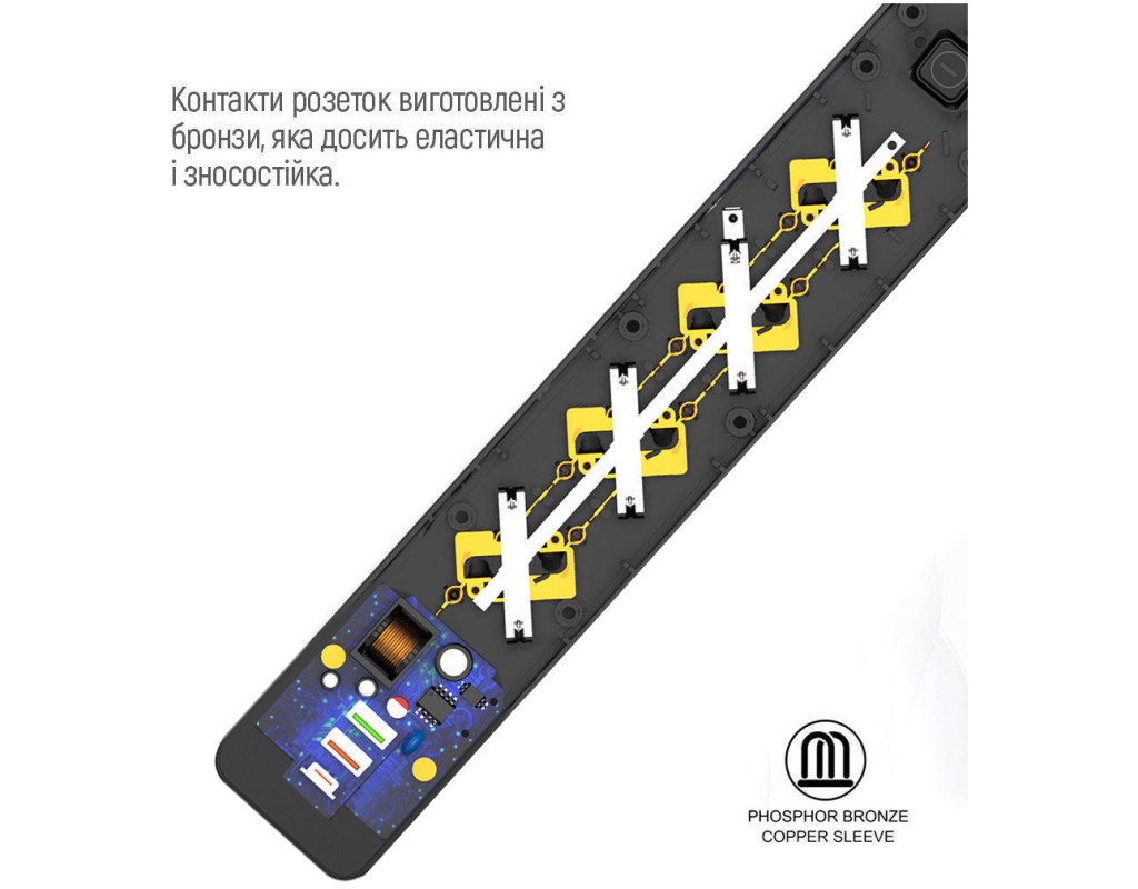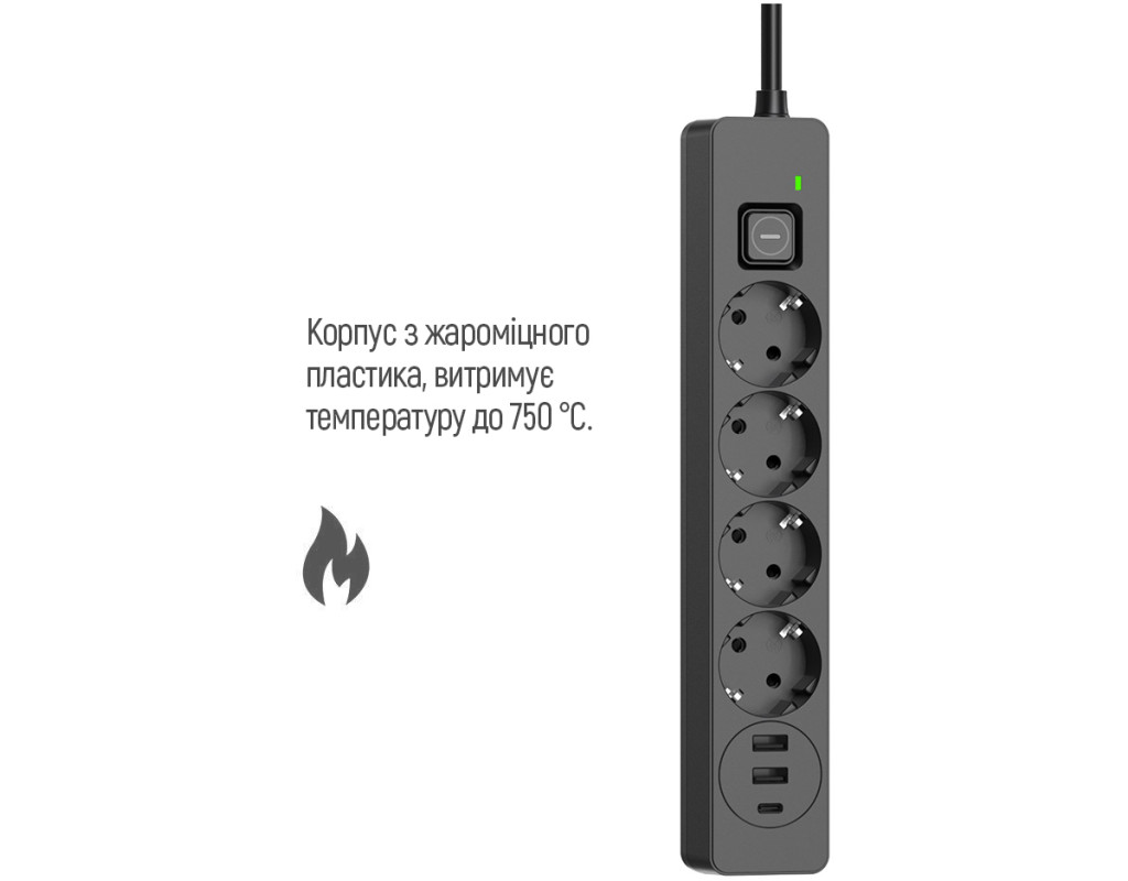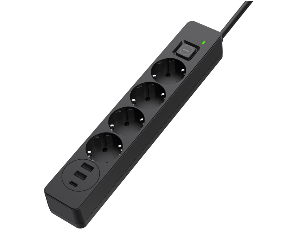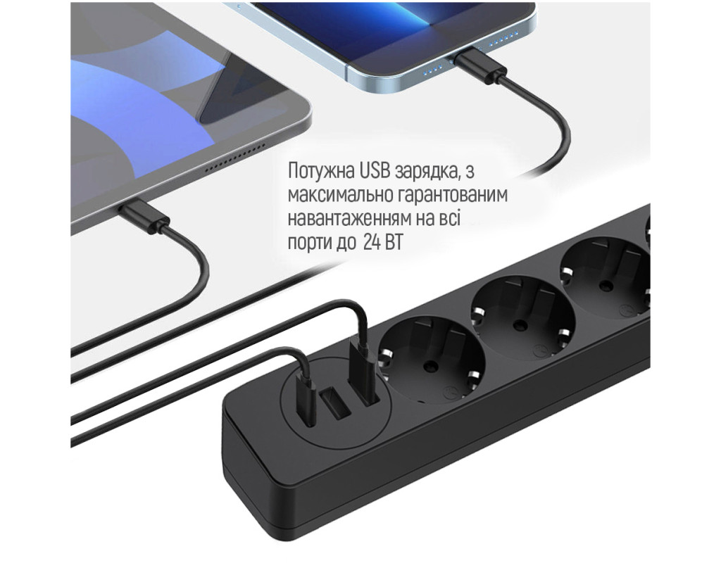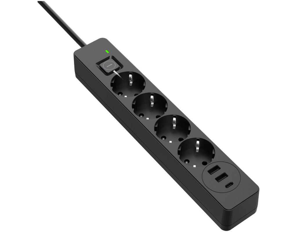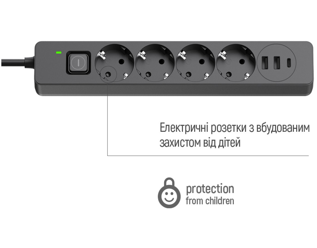 Мережевий фільтр ColorWay CW-CHE435PDB містить чотири мережеві розетки 220В і три USB-порти. Захисні шторки на розетках забезпечують безпеку використання, а автоматичний розподіл енергії між USB-портами забезпечує ефективну зарядку пристроїв (до 24Вт). Два USB-порти підтримують швидку зарядку Quick Charge 3.0, а третій порт USB-C PD підтримує швидку зарядку для Apple пристроїв. Зручна кнопка ввімкнення/вимкнення і світлодіодна індикація спрощують його використання. Подовжувач також обладнаний заземленням і захистом від перенапруги, що забезпечує безпечну роботу. Переваги: