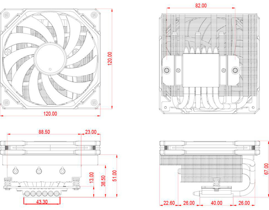 Для процесорів - INTEL, AMD, сокет - AM4, AM5, 1150, 1151, 1155, 1156, 1200, 1700, матеріал радіатора - алюміній + мідь, діаметр вентиляторів - 120 мм, Максимальна частота обертів - 2200 об/хв, Тип підшипників - гідравлічний, рівень шуму - 32.3 dB, роз'єми живлення - 4-pin PWM, Підсвічування - немає, 6 теплових труб