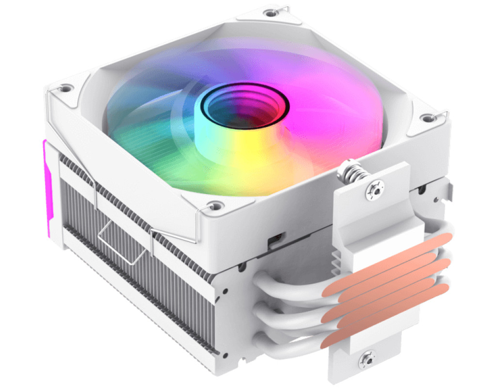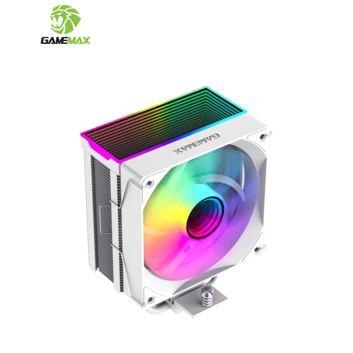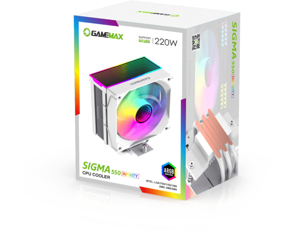 Кулер для корпусу GAMEMAX Sigma 550 Infinity WH, пофарбований у білий колір, має п’ять теплових трубок. Він підтримує процесори Intel Gen12, 13 та останню модель AMD, а також оснащений світловими ефектами ARGB. Максимальна теплова потужність процесора, з якою повинна впоратися система охолодження - 220 Вт. |