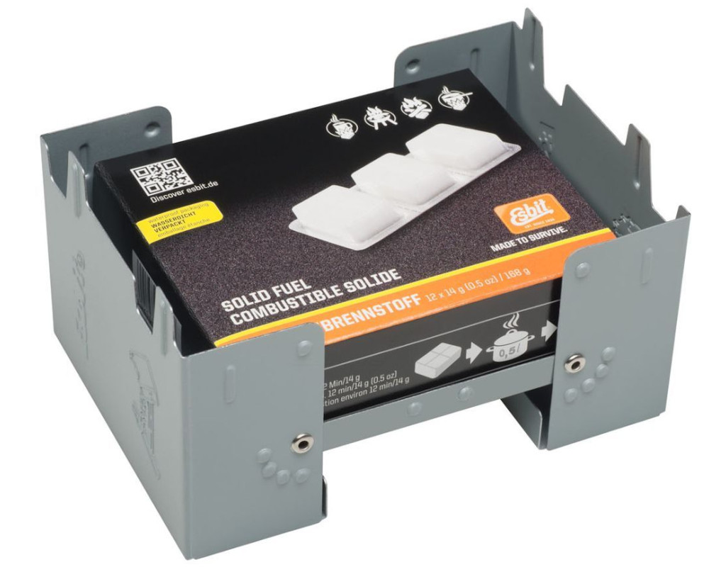 Esbit 002 890 00 - це зручний кишеньковий, твердопаливний пальник. Виготовлений із оцинкованої сталі. У комплект входить 12 таблеток твердого палива (вага кожної 14г). Таблетка горить приблизно 12 хвилин. Пальник підходить для чашок, каструль і сковорідок. Займає мінімум місця у складеному вигляді, швидко встановлюється. Особливості: