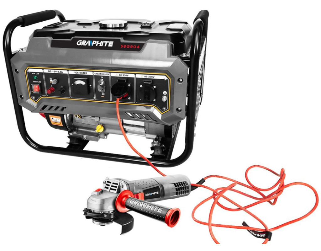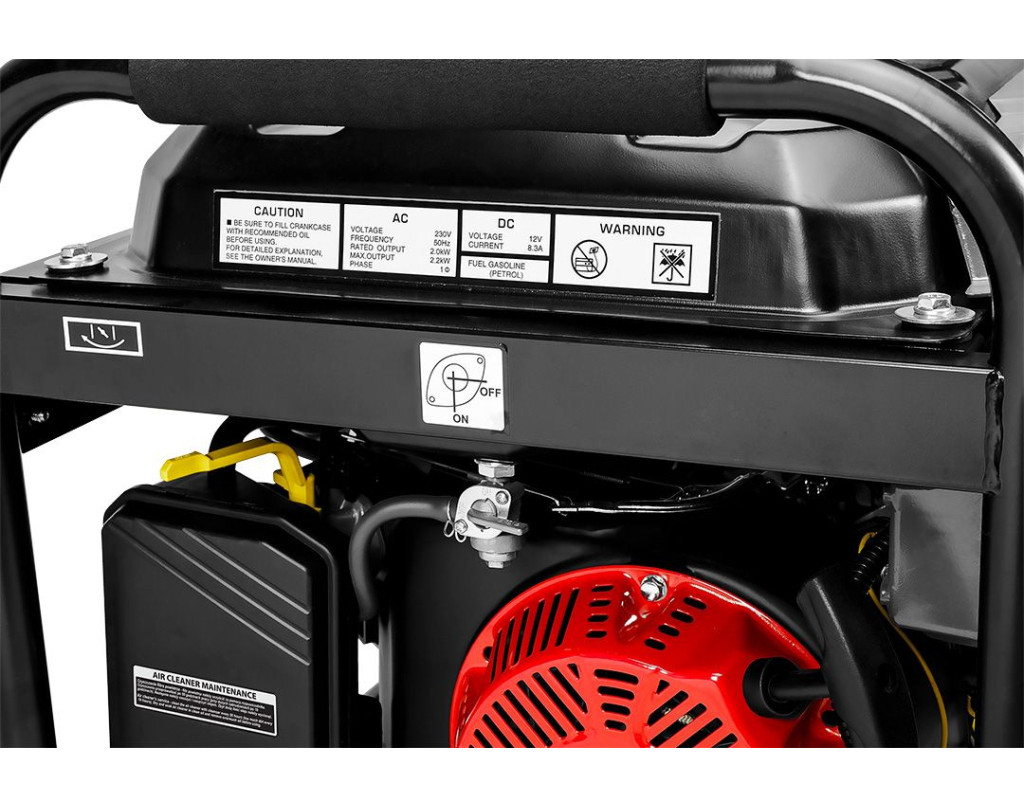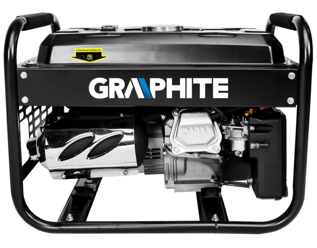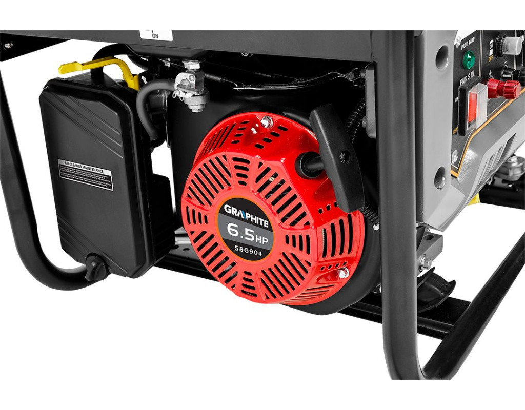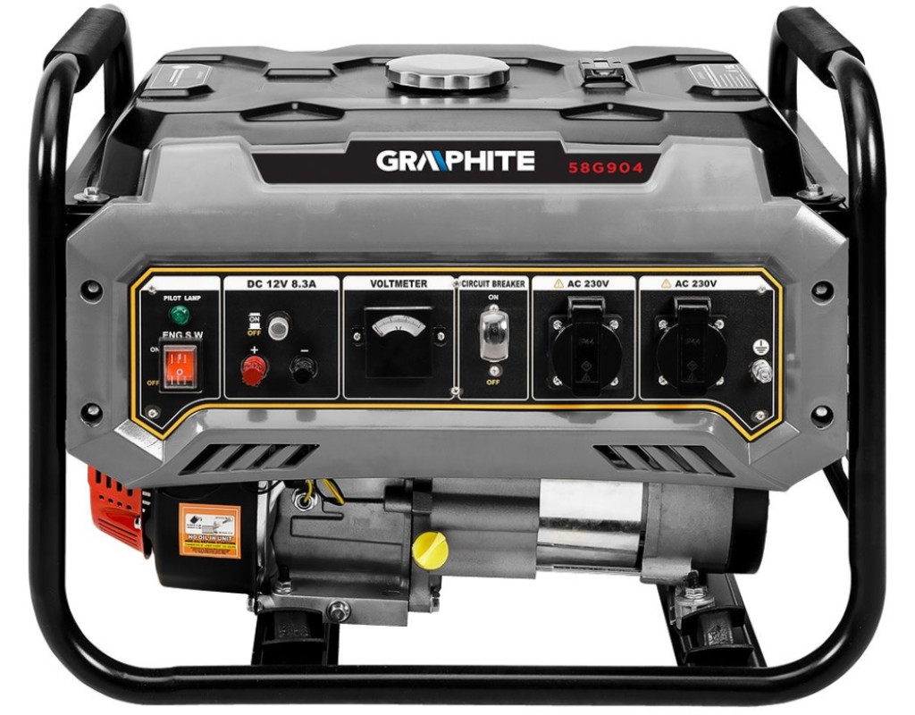 | Бензиновий генератор GRAPHITE, 58G904, 2.0/2.2 кВт Компактний, мобільний генератор максимальною потужністю 2.2 кВт (номінальна 2.0 кВт) дає змогу живити електроприлади в місцях без доступу до мережі. Використовується як автономне живлення для електроприладів, зокрема чутливої електроніки, комп'ютерів, побутової техніки тощо. Запускається вручну тросовим стартером, оснащений чотиритактним бензиновим двигуном потужністю 4,1 кВт / 6,56 к.с. Рекомендовані види палива: 92, 95 і 98 і масло SAE15W-30. Агрегат має бак ємністю 15 л і маслобак для двигуна - 0,6 л. Середня витрата палива у цієї моделі становить 2,44 л/год, а мінімальна витрата палива - 260 г/кВт-год. Агрегат відповідає стандарту ЄВРО 5 із серії європейських норм викидів. Він також має захист AVR, тобто систему, що ефективно стабілізує напругу у вихідній розетці та захист від перевантаження за струмом. Завдяки їм він забезпечує перевантажувальну безпеку для себе та інших під'єднаних до нього пристроїв. Генератор посилено захисним каркасом, який не тільки полегшує транспортування, а й захищає всю конструкцію від механічних пошкоджень. |