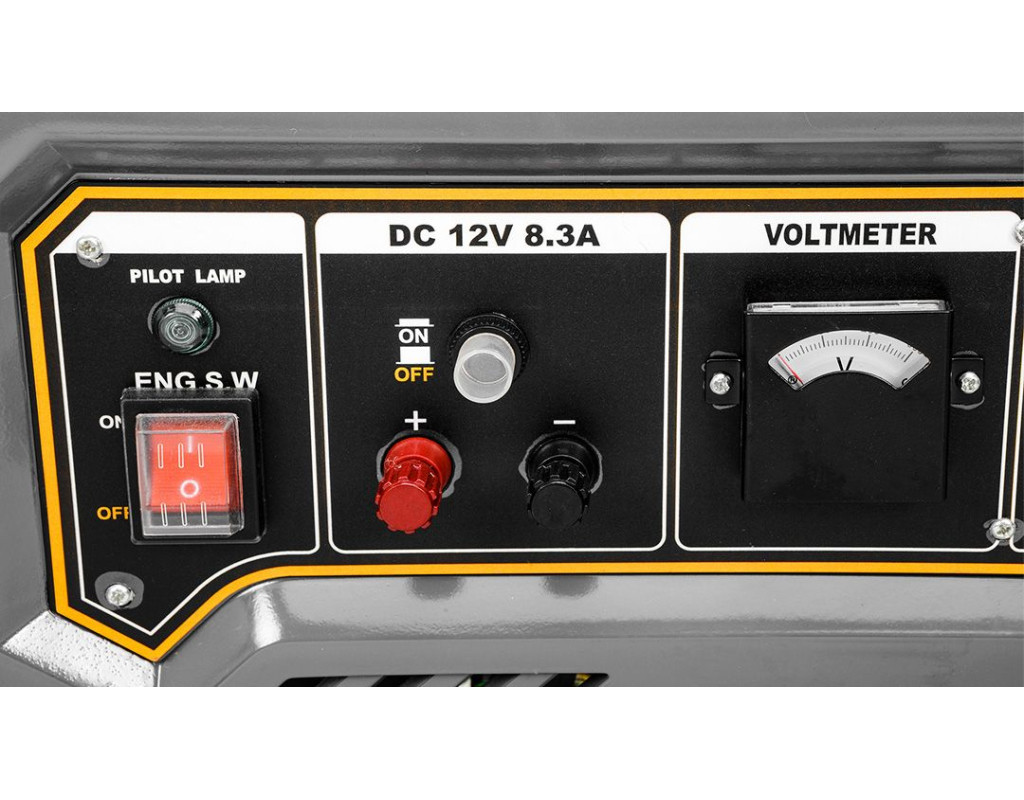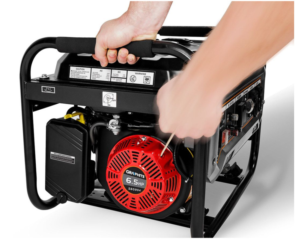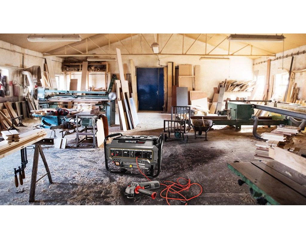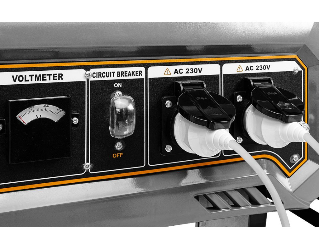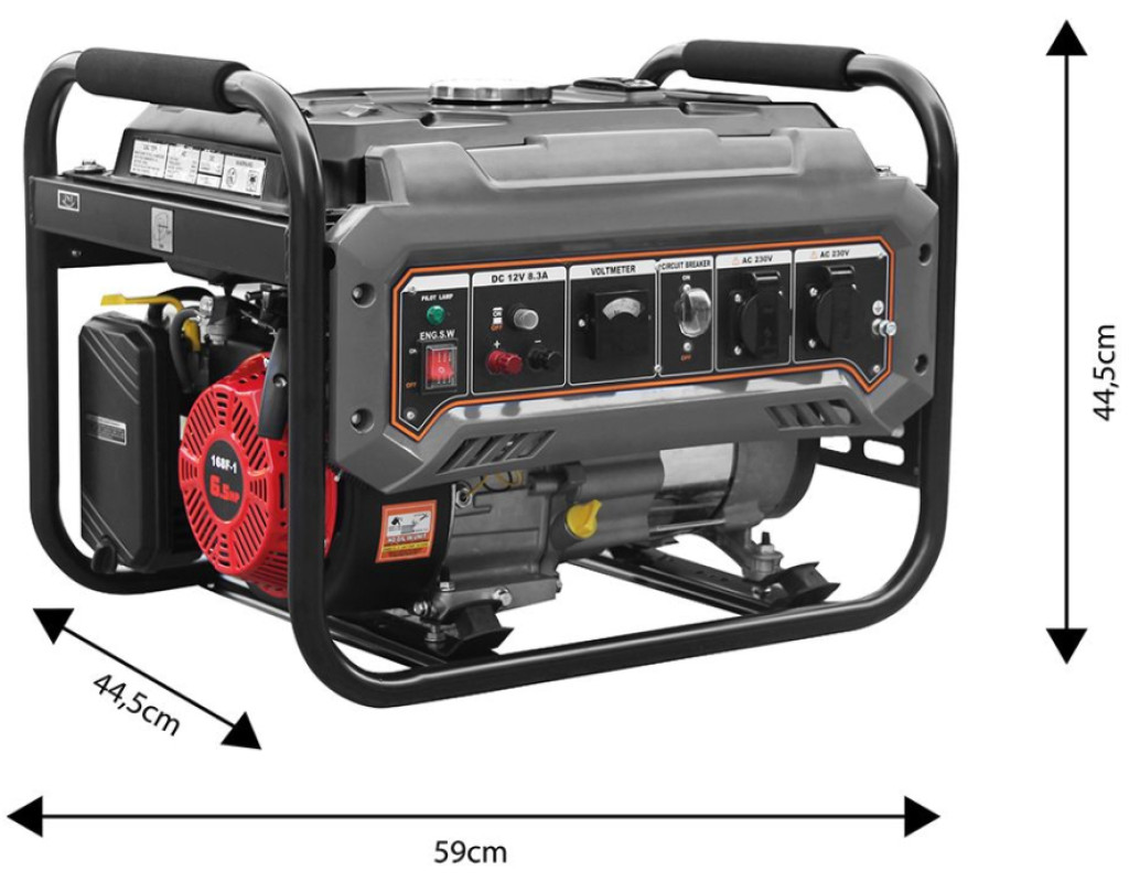 | Бензиновий генератор GRAPHITE, 58G904, 2.0/2.2 кВт Компактний, мобільний генератор максимальною потужністю 2.2 кВт (номінальна 2.0 кВт) дає змогу живити електроприлади в місцях без доступу до мережі. Використовується як автономне живлення для електроприладів, зокрема чутливої електроніки, комп'ютерів, побутової техніки тощо. Запускається вручну тросовим стартером, оснащений чотиритактним бензиновим двигуном потужністю 4,1 кВт / 6,56 к.с. Рекомендовані види палива: 92, 95 і 98 і масло SAE15W-30. Агрегат має бак ємністю 15 л і маслобак для двигуна - 0,6 л. Середня витрата палива у цієї моделі становить 2,44 л/год, а мінімальна витрата палива - 260 г/кВт-год. Агрегат відповідає стандарту ЄВРО 5 із серії європейських норм викидів. Він також має захист AVR, тобто систему, що ефективно стабілізує напругу у вихідній розетці та захист від перевантаження за струмом. Завдяки їм він забезпечує перевантажувальну безпеку для себе та інших під'єднаних до нього пристроїв. Генератор посилено захисним каркасом, який не тільки полегшує транспортування, а й захищає всю конструкцію від механічних пошкоджень. |
