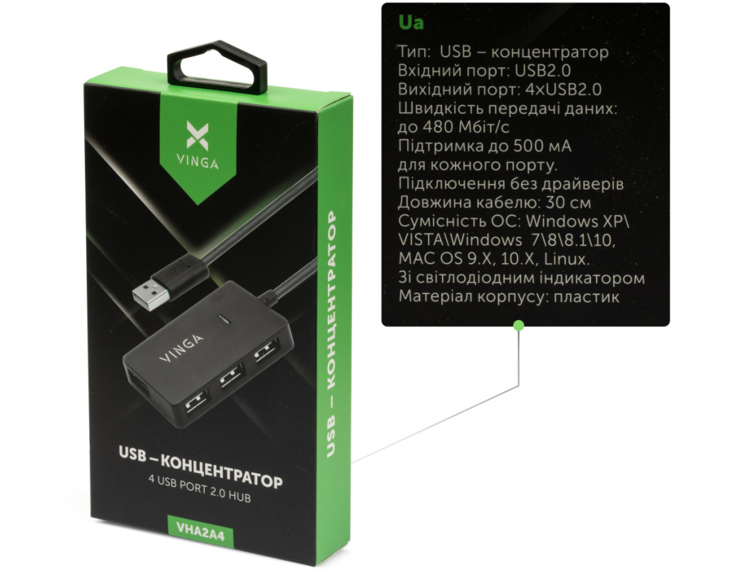 | Концентратор Vinga USB2.0 to 4*USB2.0 HUB (VHA2A4) - ідеальний вибір для тих, хто цінує якість та функціональність у кожному гаджеті. Цей зовнішній концентратор забезпечує легке підключення до вашого комп'ютера через інтерфейс USB 2.0, надаючи чотири додаткові USB 2.0 порти для підключення різноманітних пристроїв - від флешки до миші чи клавіатури. Компактність у поєднанні з кабелем довжиною 30 см робить його незамінним на робочому столі або в дорозі, забезпечуючи порядок та зручність. Обираючи Vinga, ви отримуєте відмінну якість та надійність, що підтверджено численними позитивними відгуками користувачів. Він стане великим плюсом для ефективного управління вашими USB-підключеннями без зайвих зусиль та клопоту. |