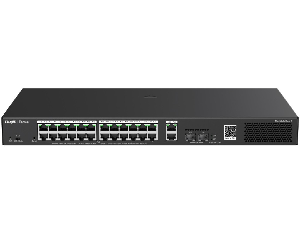 | 28-портовий гігабітний керований комутатор з 24 портами PoE+, 2 портами RJ45, 2 портами SFP