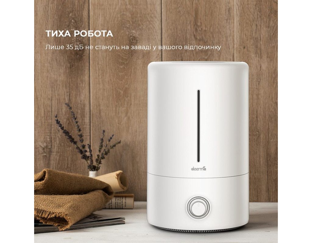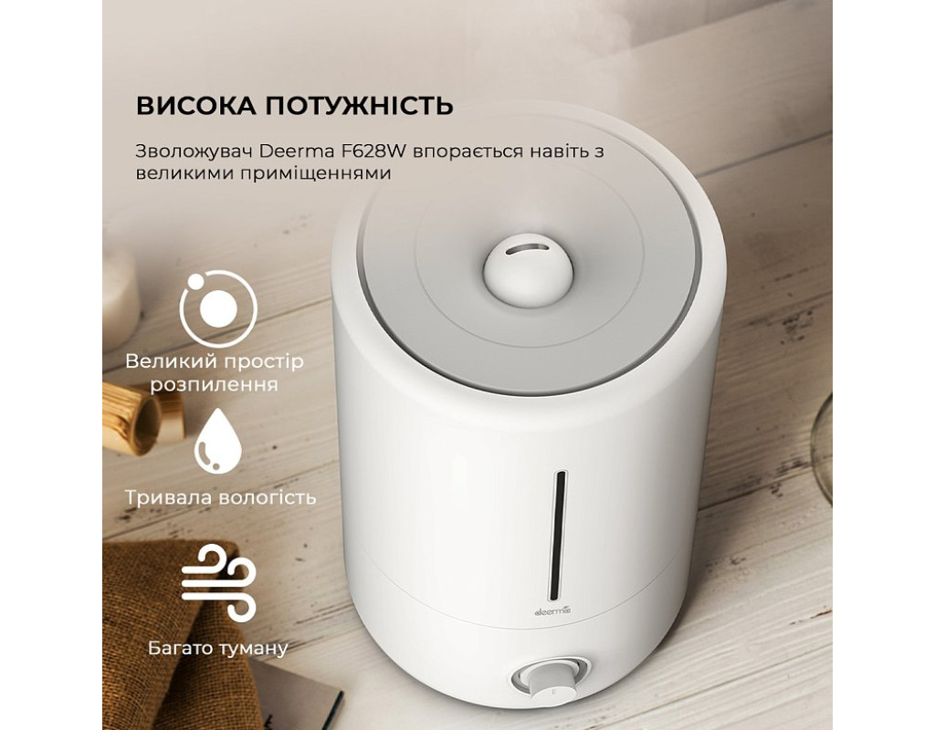 | Занадто сухе повітря може бути причиною поганого самопочуття, головного болю та навіть виникнення респіраторних захворювань. Щоб уникнути перелічених неприємностей, встановіть у приміщенні побутовий зволожувач повітря Deerma DEM-F628W, який створює та підтримує комфортні умови в будинку та офісі. Зволожувач має компактні габарити, стильний сучасний зовнішній вигляд і високу продуктивність, він забезпечить безперервне об'ємне зволоження повітря в приміщенні площею 20-30 м.кв.