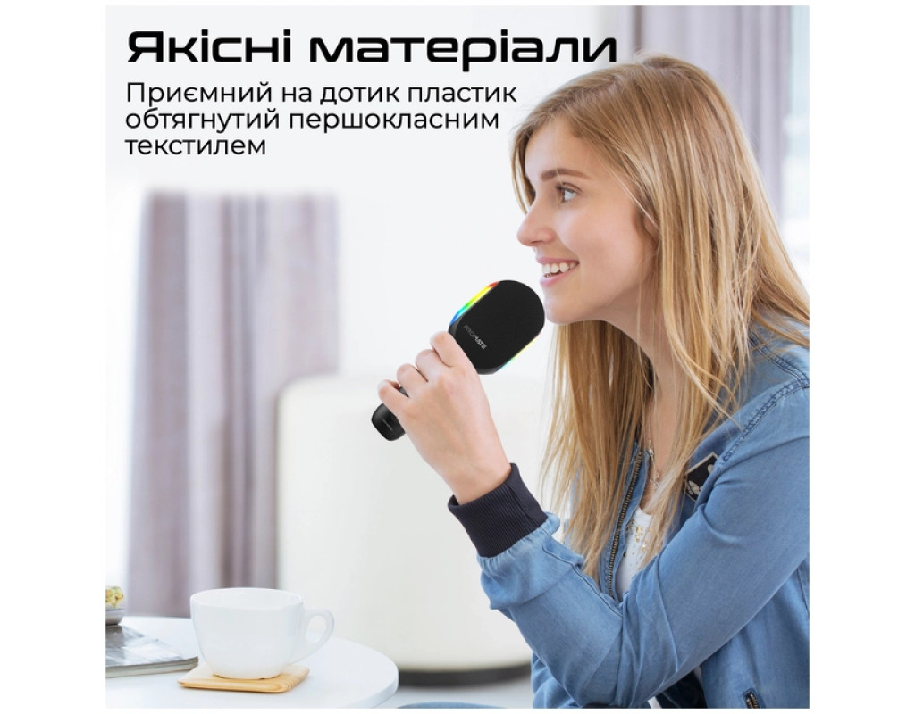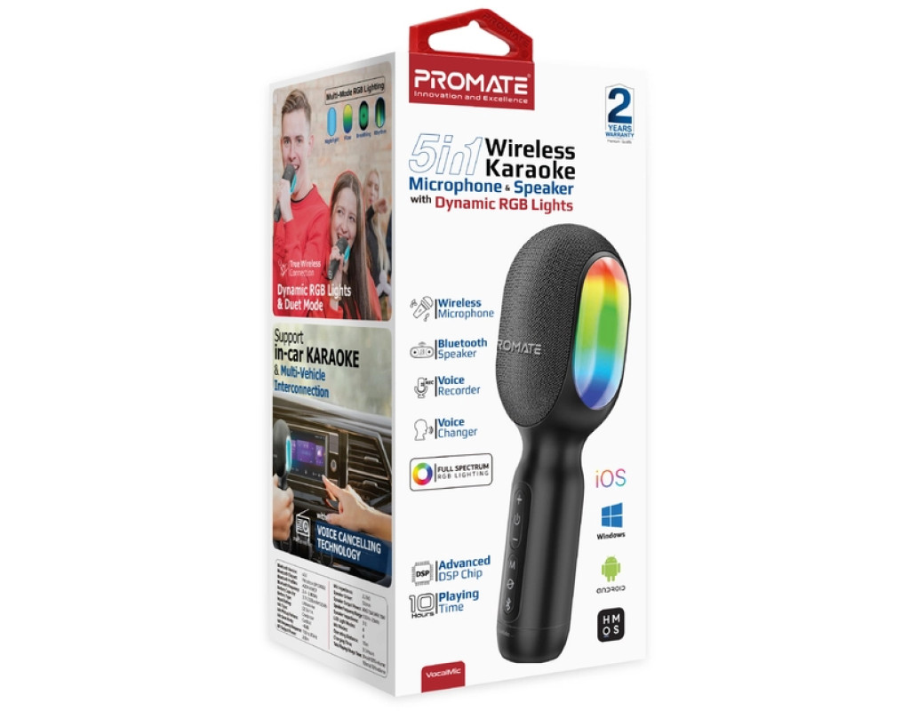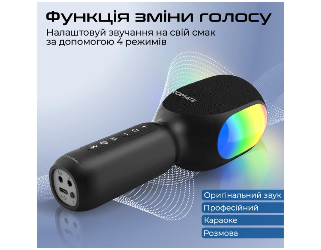 Promate VocalMic - бездротовий мікрофон для караоке з потужним динаміком, LED підсвіткою та оригінальними звуковими ефектами. Стильний дизайн, AUX порти, FM передавач, TWS, містка батарея дозволяють співати, проводити зустрічі та влаштовувати вечірки де б ти не знаходився.