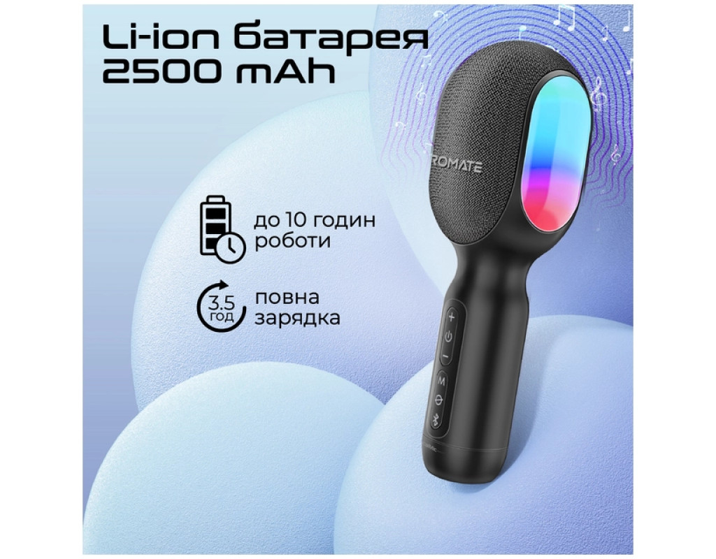 • Li-ion батарея 2500 mAh: Співай улюблені треки до 10 годин у режимі non-stop. Повністю зарядити мікрофон можна за 3.5 годин через USB-C кабель, який йде в комплекті.