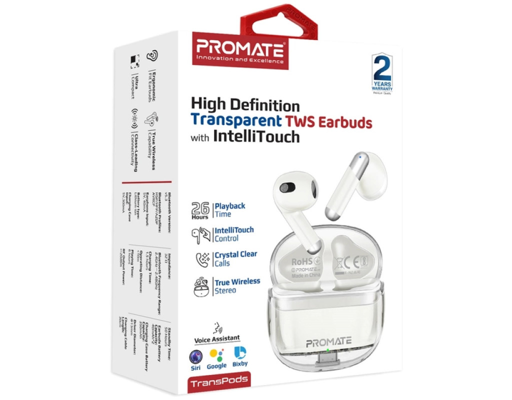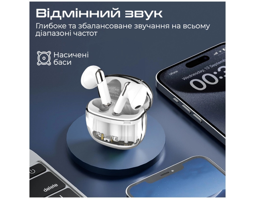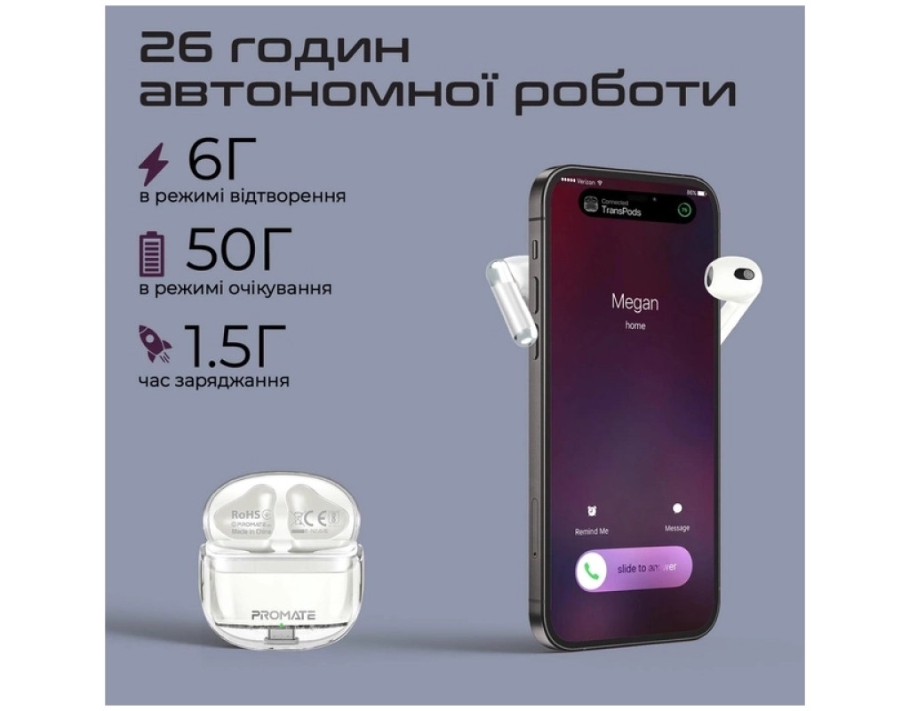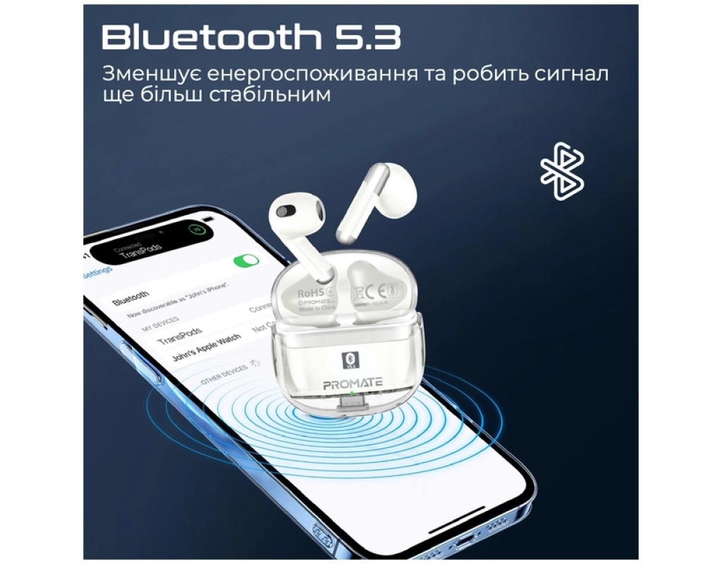TransPods - нова модель у лінійці навушників-вкладишів від Promate. Поєднала в собі насичене звучання, прозорий стильний дизайн і HD мікрофони. Найкращий вибір для тих, хто завжди в русі. Особливості: - Bluetooth 5.3: Найсучасніша версія з функцією динамічної оптимізації потужності, зменшує енергоспоживання та робить сигнал ще більш стабільним.