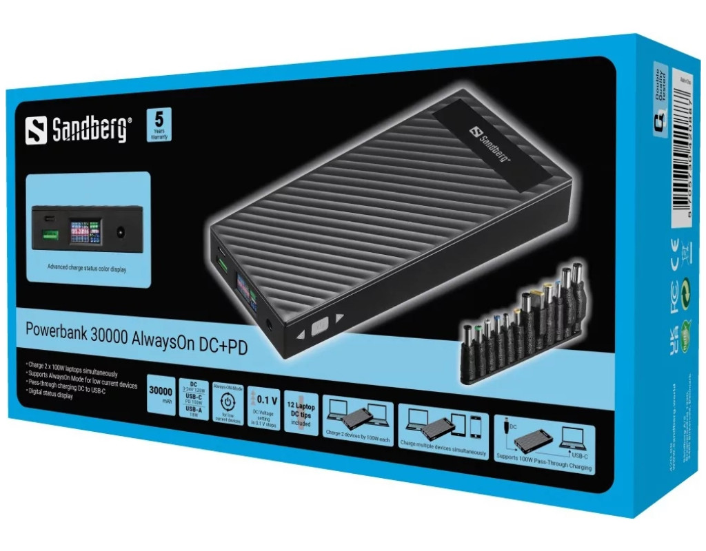 Універсальна мобільна батарея Sandberg PD 30000mAh 200W PD+DC (420-88) – пристрій, який допоможе швидко поповнити заряд ваших мобільних пристроїв, у тому числі – ноутбуків та Macbook. УМБ заряджається за допомогою адаптера змінного струму або роз’єма USB-C. Вона підтримує функцію швидкого зарядження та поповнює заряд за 90 хвилин до 100%. Потужного акумулятора ємністю 30000 мА*год вистачає на декілька зарядів смартфона. Ви також зможете одночасно зарядити два ноутбуки з потужністю по 100 Вт. Функція power-through дозволяє робити це при зарядженні УМБ. Універсальна мобільна батарея Sandberg PD 30000mAh 200W PD+DC укомплектована набором із 12 різних перехідників – заряджайте пристрої з різними роз’ємами на максимальній швидкості без додаткових кабелів. Додаткова функція AlwaysOn дозволяє заряджати вироби з низьким енергоспоживанням без функції автоматичного вимкнення. Компактні розміри та невелика вага батареї Sandberg PD 30000mAh 200W PD+DC роблять її зручною для перенесення. |