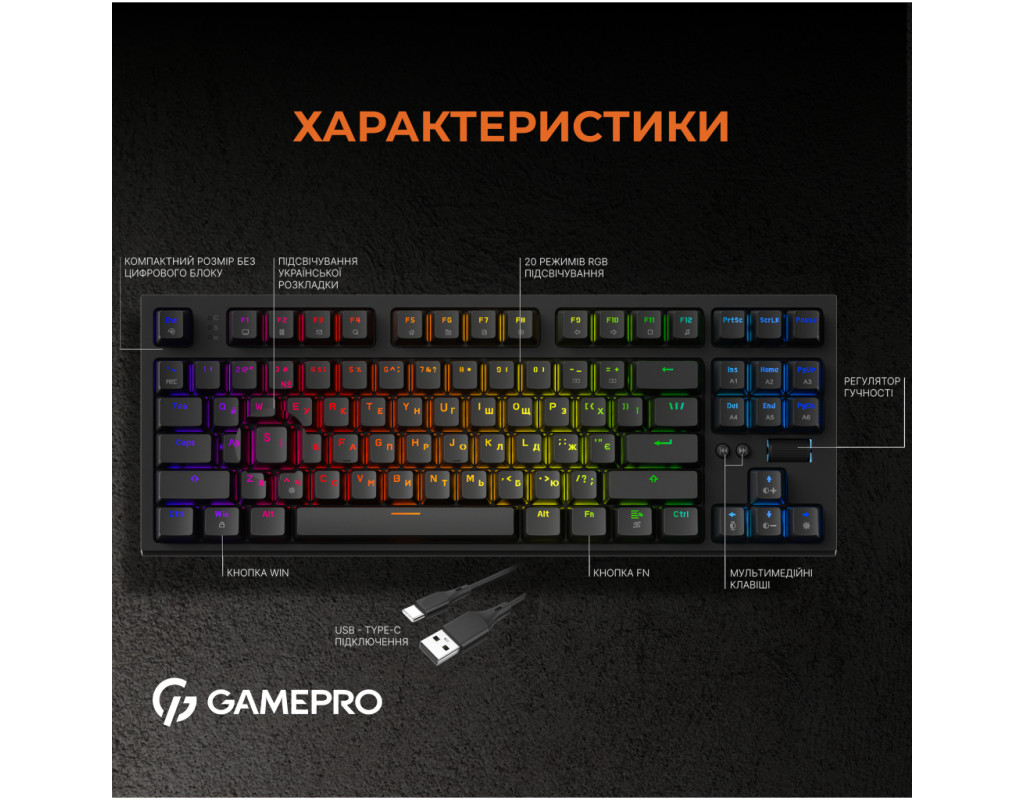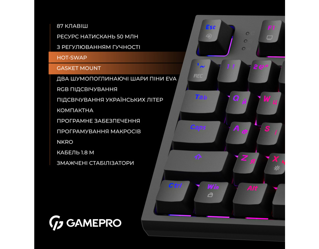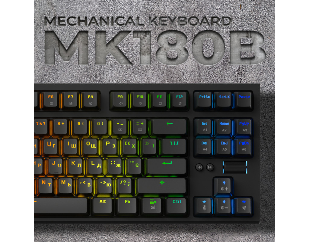 | Клавіатура GamePro MK180B Hot-Swap Red Switch RGB USB UA Black (MK180B) – це ідеальний вибір для геймерів та професіоналів, які цінують стиль, високу продуктивність та комфорт. Поєднуючи в собі сучасні технології та ергономічний дизайн, ця механічна клавіатура стане вашим універсальним помічником у світі цифрових розваг та робочих завдань. Завдяки підтримці RGB-підсвічування з можливістю налаштування різноманітних режимів, ви зможете підкреслити свою індивідуальність. Підсвічування керується не лише через програмне забезпечення, а й комбінаціями клавіш, що додає зручність у використанні. Насолоджуйтесь неймовірними візуальними ефектами, які оживляють кожне натискання. Важливою характеристикою є перемикачі Outemu Red Hot-Swap – лінійні перемикачі, що забезпечують приємний, тихий звук та м’якість натискань. Вони мають ресурс до 50 мільйонів натискань, що гарантує довговічність цього пристрою. Hot-Swap система унікальна тим, що дозволяє змінювати перемикачі без пайки, відкриваючи нові горизонти для кастомізації. Клавіатура має формат TKL, або tenkeyless, з 87 клавішами, які максимально оптимізують простір робочого місця. Зручний регулятор гучності та мультимедійні клавіші спрощують керування мультимедійними функціями. Завдяки Gasket mount конструкції з двома шарами піни EVA, забезпечується додаткове поглинання шуму для ще більш комфортного використання. Тип підключення – дротовий через USB, з сумісністю для операційних систем Windows та Linux, що робить клавіатуру універсальною для різних пристроїв. З'ємний USB-C кабель, довжиною 1.8 м, додає комфорту у використанні. Розкладка містить як українські, так і англійські символи, з підсвіченими літерами для зручності набору тексту в темряві. Комплектація клавіатури порадує всіх, хто любить кастомізацію та зручність: знімний кабель USB-A/USB-C, два запасні перемикачі, пулери для кейкапів та перемикачів, а також додатковий набір кейкапів. Дві пари ніжок різного рівня дозволяють регулювати кут нахилу, забезпечуючи максимальний комфорт. GamePro MK180B – це не просто клавіатура, а ваш надійний союзник, що забезпечить максимальну продуктивність і задоволення від кожного натискання. Це вибір для тих, хто цінує якість та надійність у кожному елементі. |