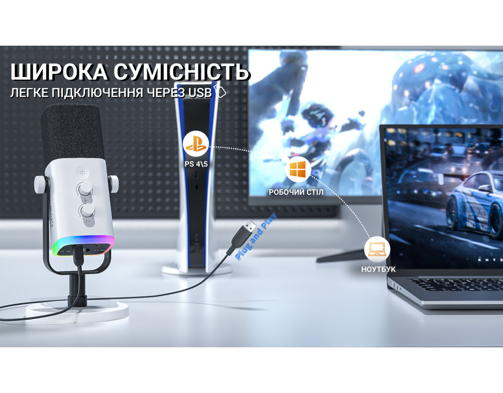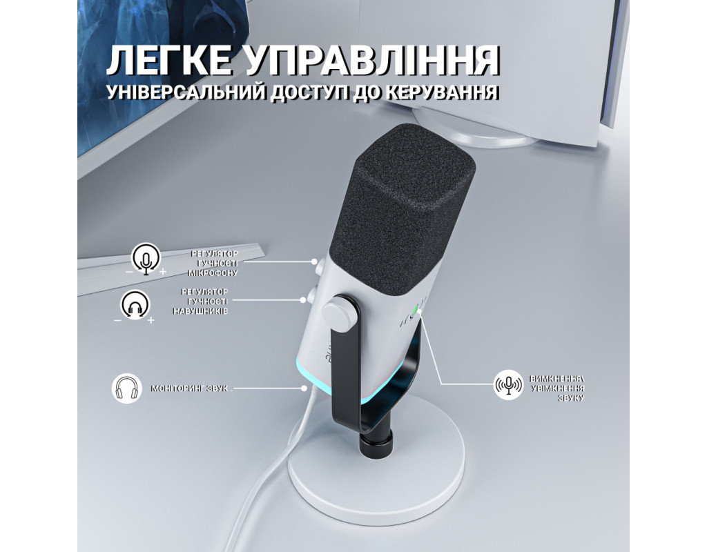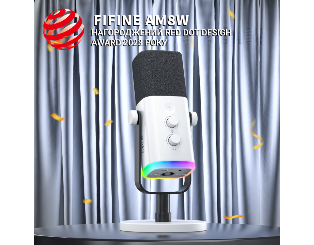 Fifine Ampligame AM8 представляє собою динамічний мікрофон з проводовим USB і XLR підключенням, який відмінно підійде для запису підкастів, стримів, озвучки, проведення трансляцій. Він має кардіоїдний капсуль, який забезпечує високу чіткість та деталізацію мови. У комплекті постачається стійка для зручного розміщення мікрофона на столі. Для моніторингу голосу в реальному часі є вихід на навушники. RGB-підсвічування на основі мікрофона дозволить створити унікальну атмосферу під час запису. |