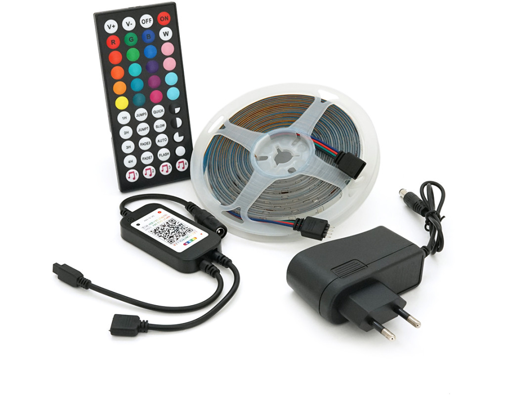 | Комплект музичної світлодіодної стрічки 3528 RGB 5 метрів, 54Led, пульт, блок живлення, bluetooth, ip65 |