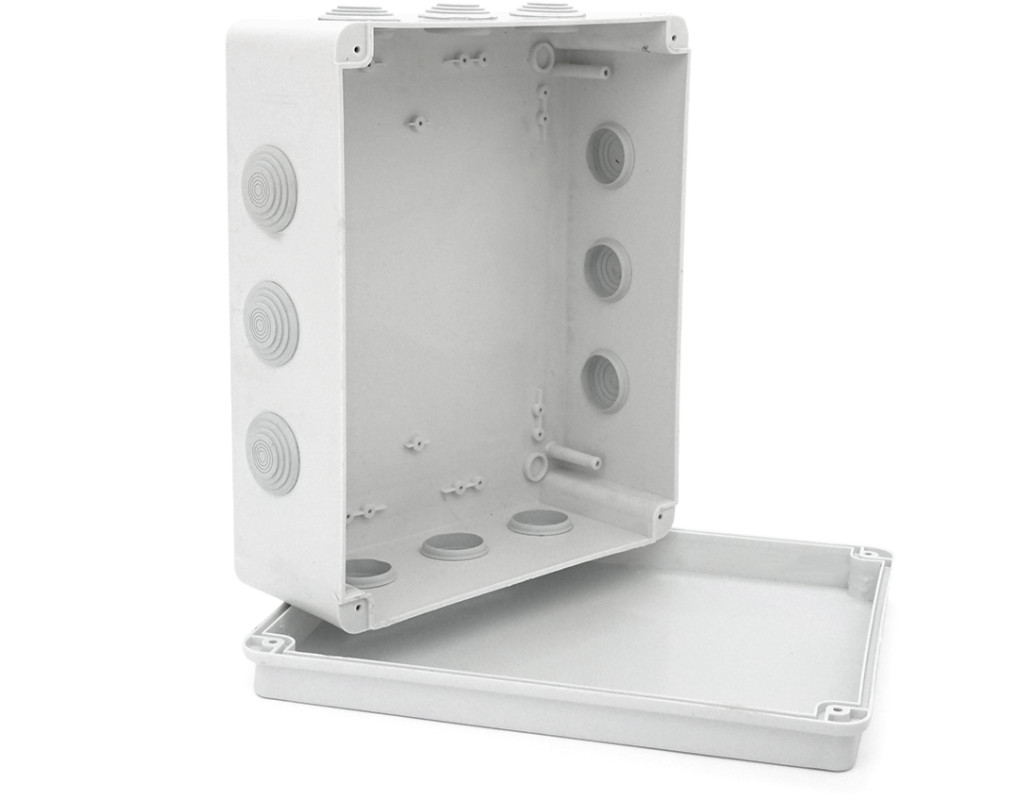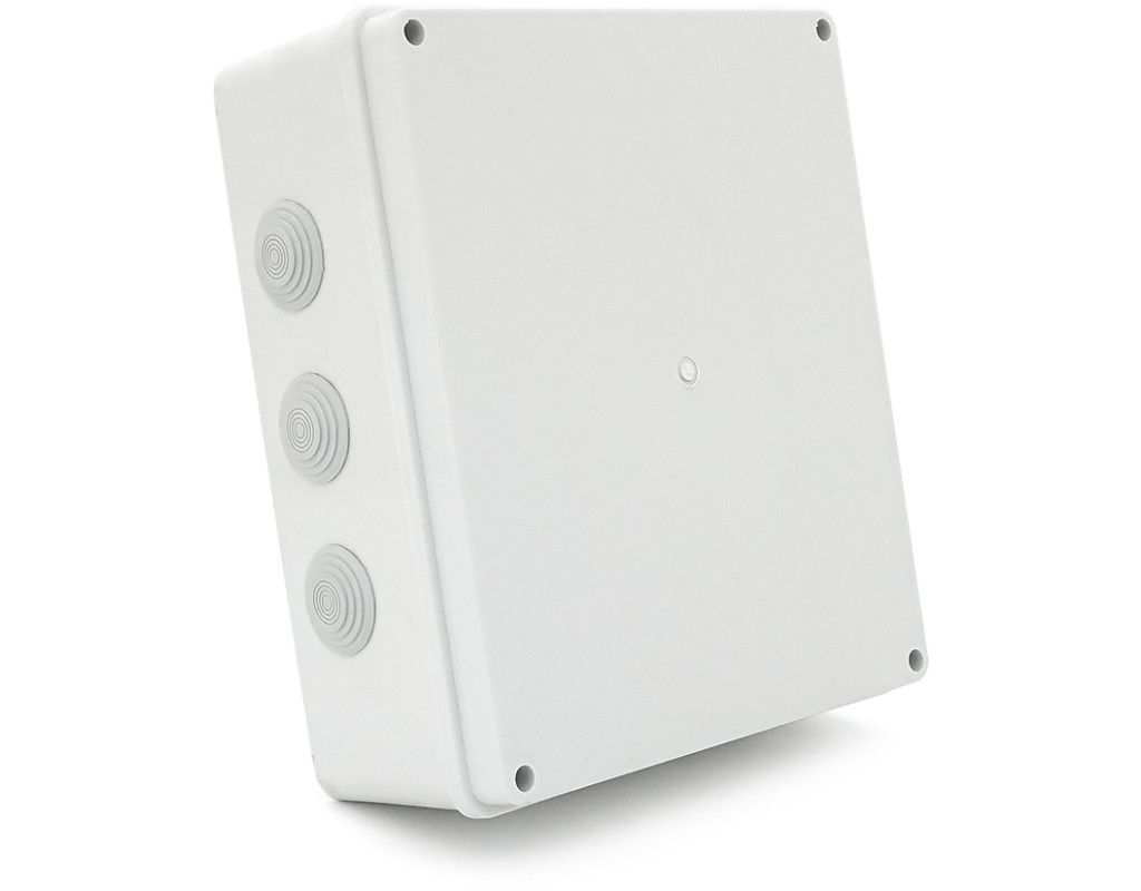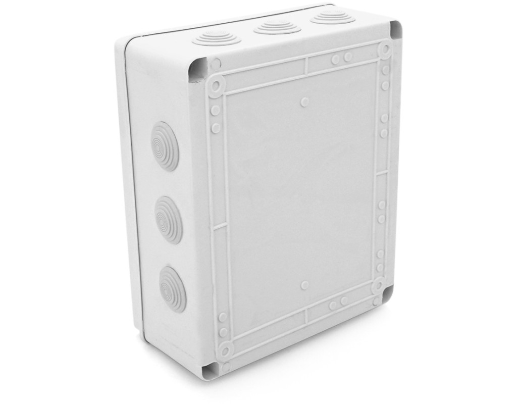 | Коробка розподільна, комутаційна, використовується для комутації силових та слаботочних мереж на вулиці та всередині приміщень. відеоспостереження, сигналізацій, промислової та побутової автоматики. матеріал – пластик кількість гермовводів -12 ступінь захисту – IP55 розмір -300х250х120мм колір-білий |