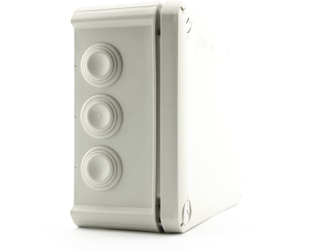 | Коробки виготовлені з термопластичного полімеру поліпропілену з сальниками з етиленового вінілового ацетату (EVA). Це дозволяє встановлення кабелів або безпосередньо через 7 сальників x M25, або сальники можуть бути порізані ножем у попередньо зазначених пунктах, щоб створити вставку, що відкривається для кабелів або труб. Альтернативно, кабельні муфти можуть бути висунуті від відкриттів замість сальників і замкнені з контргайкою від внутрішньої частини. Коробки можуть бути встановлені на пластинах, що підвищуються, у відкриттях на підлозі, використовуючи гвинти сталі 3.5 x 9.5. |