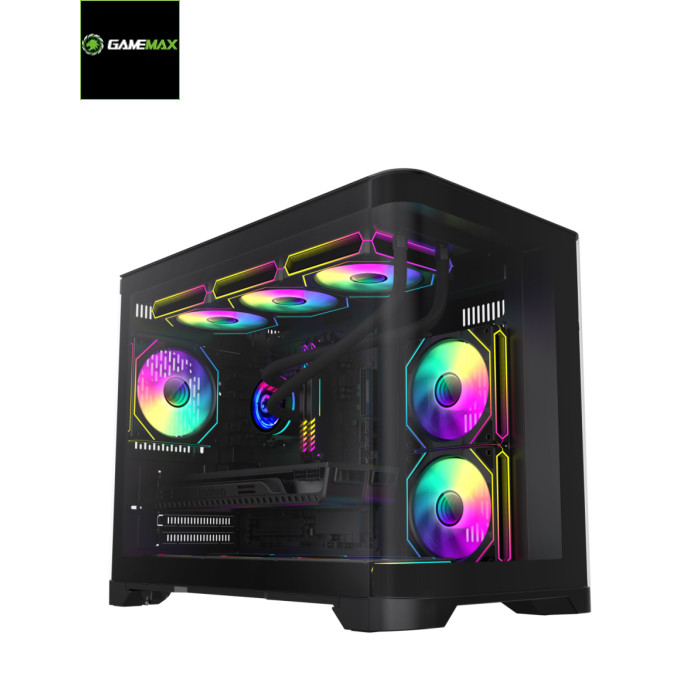 Корпус ПК HYPE-M Premium Micro ATX від GameMax має унікальний шлях повітряного потоку, що забезпечує широкий діапазон сумісності та безліч варіантів охолодження. має фаски під кутом 45 градусів, призначені для плавного малюнку. Корпус комп’ютера, зосереджений на охолодженні – 3 попередньо встановлені 120-мм вентилятори ARGB – 2 знизу та один у задній частині корпусу, сприяють чудовій вентиляції. Верхня частина HYPE підтримує радіатор діаметром до 360 мм. Подвійна вигнута скляна панель. Панель виготовлена з вигнутого скла з красивими лініями та плавним баченням. Конструкція передньої камери приховує кабелі, зберігаючи ваш ПК вільним від безладу, візуально привабливим і прохолодним. Цей корпус Mid-tower сумісний із найбільшими картами серії NVIDIA 4000 завдяки достатньому простору для відеокарт довжиною до 400 мм і висотою до 157 мм (для режиму повітряного охолодження). |