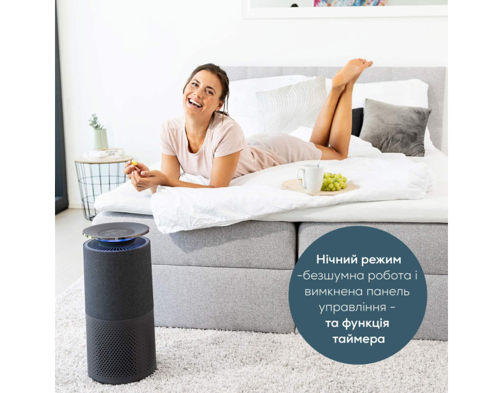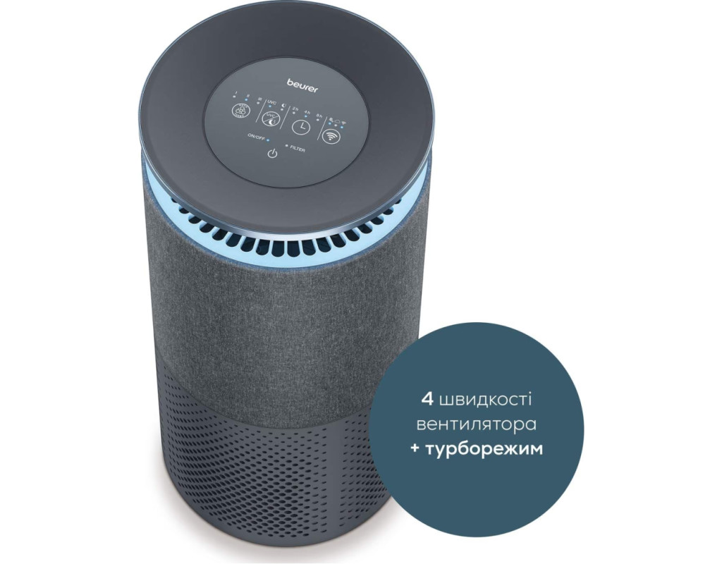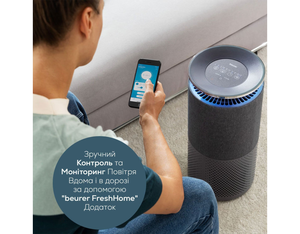 Розумний очищувач повітря Beurer LR 401 вражає своїм сучасним дизайном та високою продуктивністю. Очищувач повітря LR 401 з тришаровою системою фільтрації. Завдяки круглій формі пилок, що знаходяться навколо очищувача повітря, домашній пил, шерсть тварин, запахи, різні бактерії та віруси ефективно всмоктуються і фільтруються. Ви можете сісти та розслабитися, поки очищувач виконує налаштування відповідно до забрудненості повітря. За допомогою інтелектуальної автоматичної функції LR 401 розпізнає дрібний пил з розміром частинок 2,5 мкм і адаптує ефективність очищення до повітря в приміщенні для покращення якості повітря та покращення самопочуття. Очищувач повітря Beurer позбавляє до 99,95% шкідливих речовин у повітрі: пил, шерсть, запахи, пилок, бактерії, віруси. Повітроочисник оснащений таймером та тихим нічним режимом. Ідеально підходить для спальної кімнати площею до 69 м2. Зручне керування та моніторинг повітря в приміщенні будинку та в дорозі за допомогою безкоштовного додатка «Beurer FreshHome». Основні характеристики очищувача повітря Beurer LR 401: