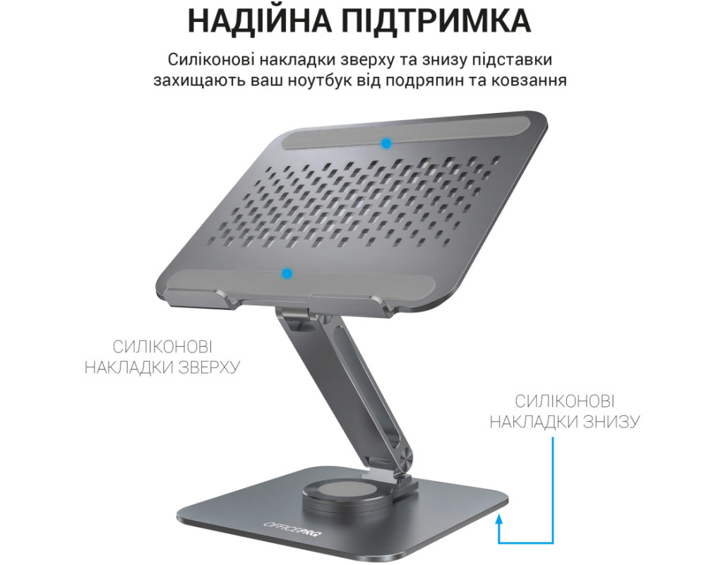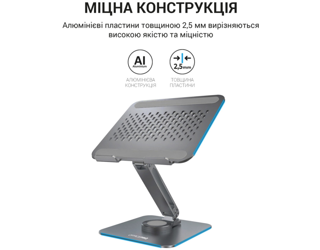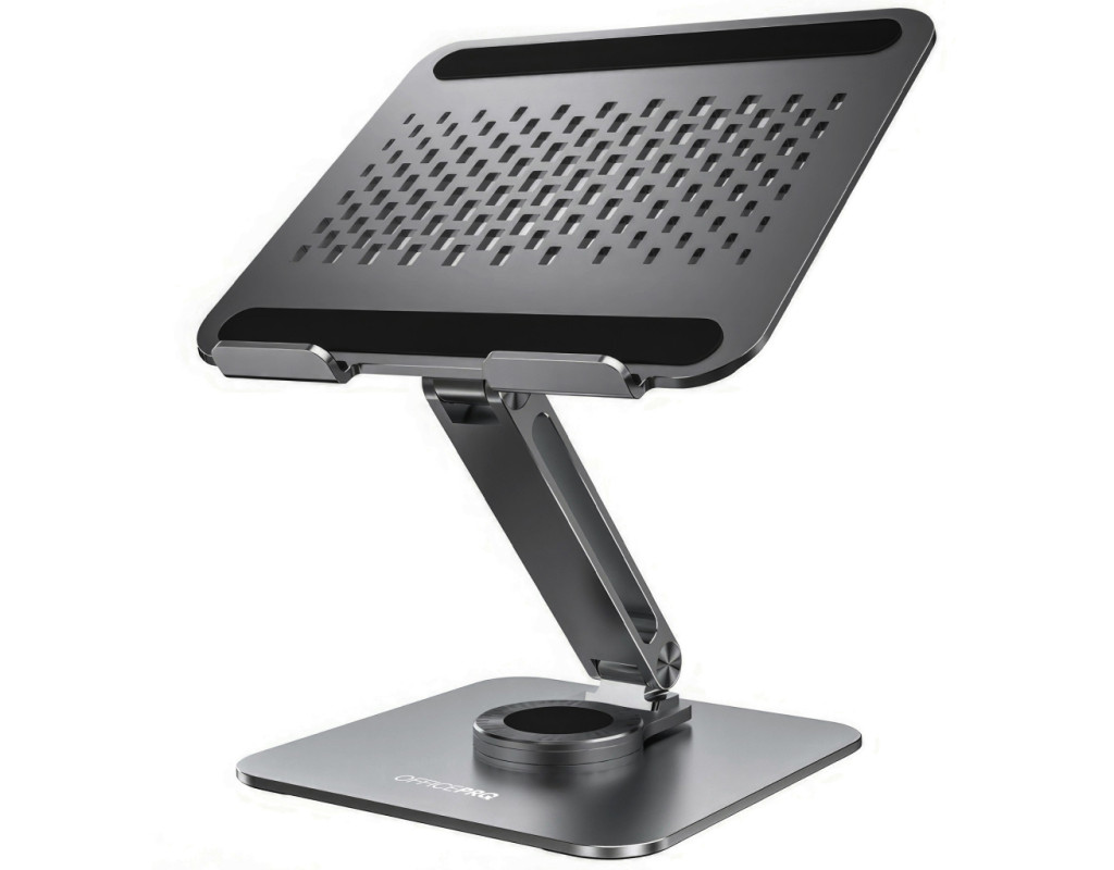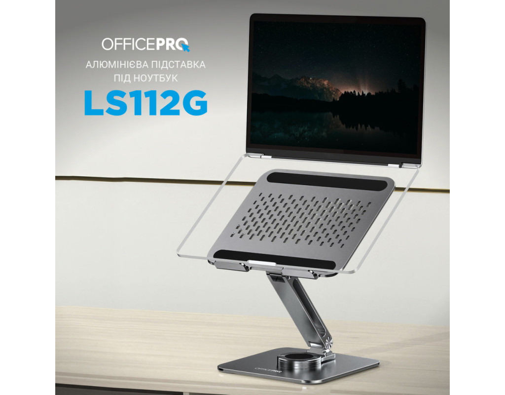 Оптимізуйте свою робочу ефективність і комфорт з підставкою для ноутбука OfficePro LS112G, що поєднує в собі мінімалістичність і зручність використання. Завдяки регульованому куту нахилу, ви зможете зручно налаштувати екран ноутбука для оптимального перегляду і комфортної роботи. Додатково, обертання на 360 градусів дає змогу швидко та легко змінювати орієнтацію пристрою, забезпечуючи повний доступ до всіх його портів і функцій. Підставка виготовлена з надійної алюмінієвої конструкції, що забезпечує стійкість і довговічність використання. Силіконові антиковзкі накладки на основі підставки і на опорних поверхнях допомагають уникнути ковзання ноутбука і забезпечують його надійну фіксацію. Особливості: