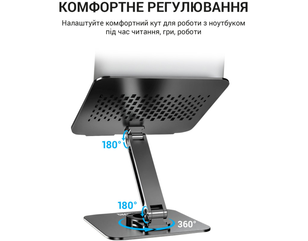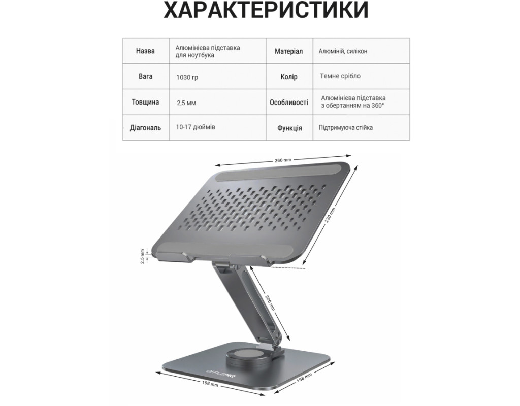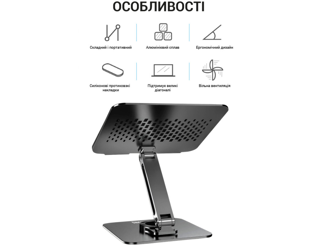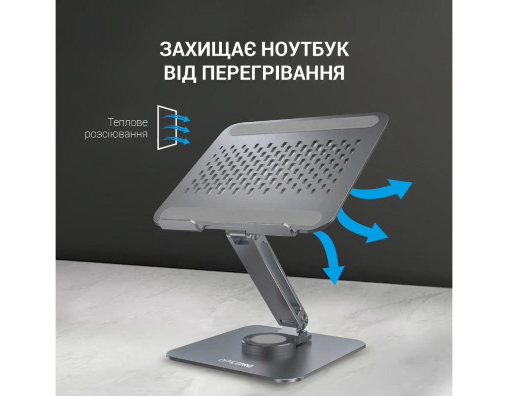 Оптимізуйте свою робочу ефективність і комфорт з підставкою для ноутбука OfficePro LS112G, що поєднує в собі мінімалістичність і зручність використання. Завдяки регульованому куту нахилу, ви зможете зручно налаштувати екран ноутбука для оптимального перегляду і комфортної роботи. Додатково, обертання на 360 градусів дає змогу швидко та легко змінювати орієнтацію пристрою, забезпечуючи повний доступ до всіх його портів і функцій. Підставка виготовлена з надійної алюмінієвої конструкції, що забезпечує стійкість і довговічність використання. Силіконові антиковзкі накладки на основі підставки і на опорних поверхнях допомагають уникнути ковзання ноутбука і забезпечують його надійну фіксацію. Особливості: