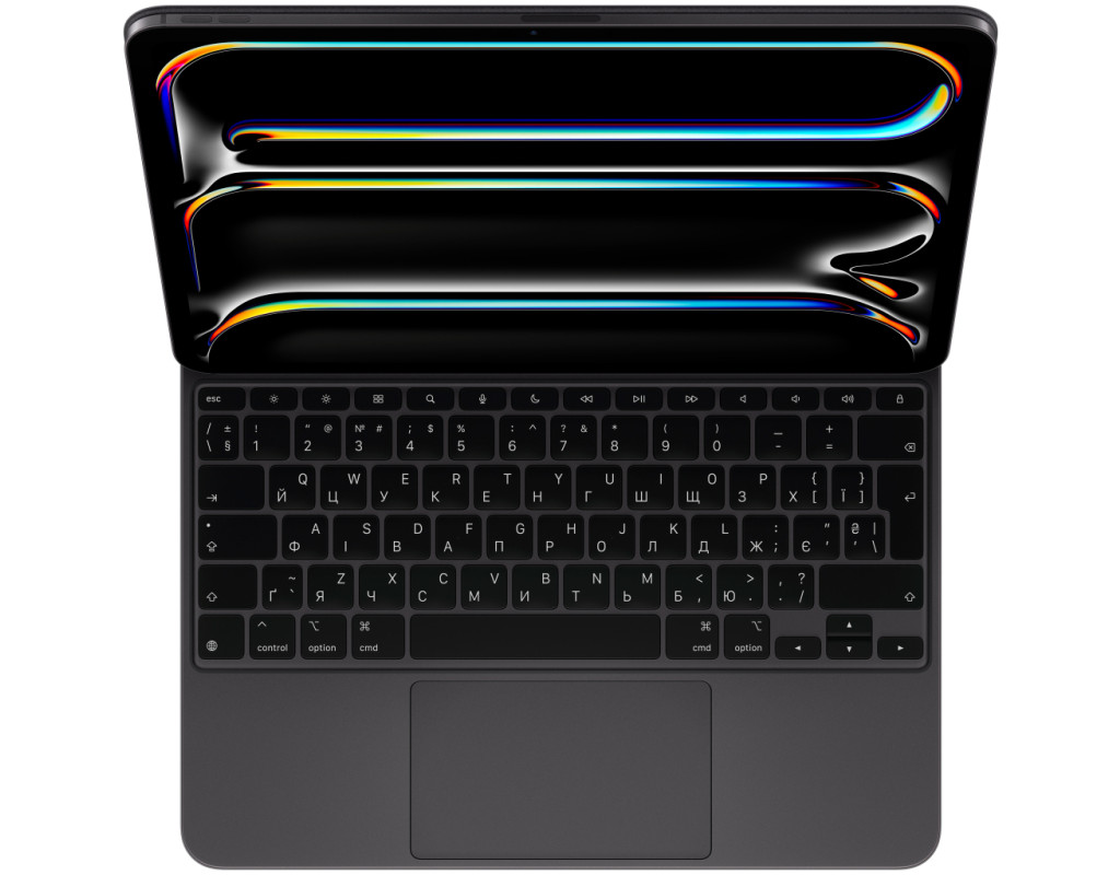| Magic Keyboard. Дивовижна клавіатура для iPad. Клавіатура Magic Keyboard у новому дизайні зручна й чутлива, а ще надзвичайно легка й компактна. Її обладнано трекпедом, який відкриває нові можливості для роботи. Клавіатура дає змогу плавно змінювати кут нахилу, має підсвічування клавіш і порт USB-C, надійно захищає пристрій з обох боків та доступна у двох нових кольорах.