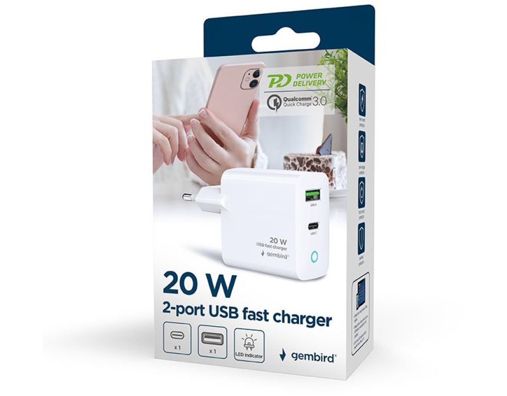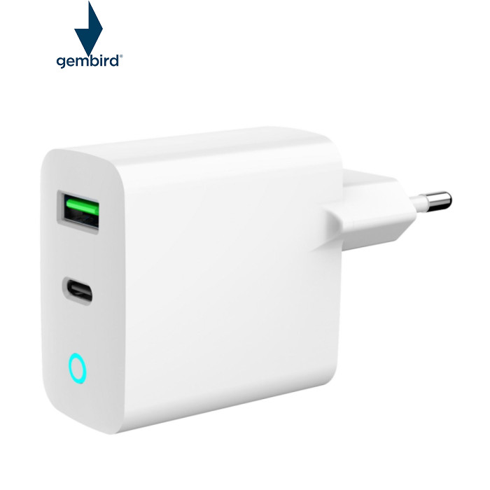 | Зарядний пристрій Gembird 1xUSB-A + 1 Type-C (PD20Вт + QC3.0 18Вт) у вишуканому білому кольорі (TA-UC-PDQC20L-W-01) — це ідеальний вибір для тих, хто шукає ефективність та надійність. Цей адаптер відрізняється своєю універсальністю та здатністю забезпечити швидку зарядку для різноманітних пристроїв, включаючи екшн-камери, TWS навушники та смартфони. Оснащений двома портами — USB Type-C і USB-A, цей пристрій здатний надавати вражаючу потужність до 20 Вт через Type-C з підтримкою технології PowerDelivery, що значно скорочує час підзарядки. Порт USB-A, у свою чергу, забезпечує швидкість зарядки до 18 Вт завдяки використанню технології Quick Charge 3.0. Зарядний пристрій включає в себе функцію інтелектуального захисту, яка оберігає ваші пристрої від перевантажень, перенапруги, коротких замикань та перегріву. Це гарантує безпеку та надійність під час користування. Додатковою перевагою є зручний світлодіодний індикатор, який показує стан заряджання, що робить процес підзарядки простим і зрозумілим. З максимальним вихідним струмом у 3 А, цей зарядний пристрій є потужним інструментом для тих, хто цінує якість та надійність. |