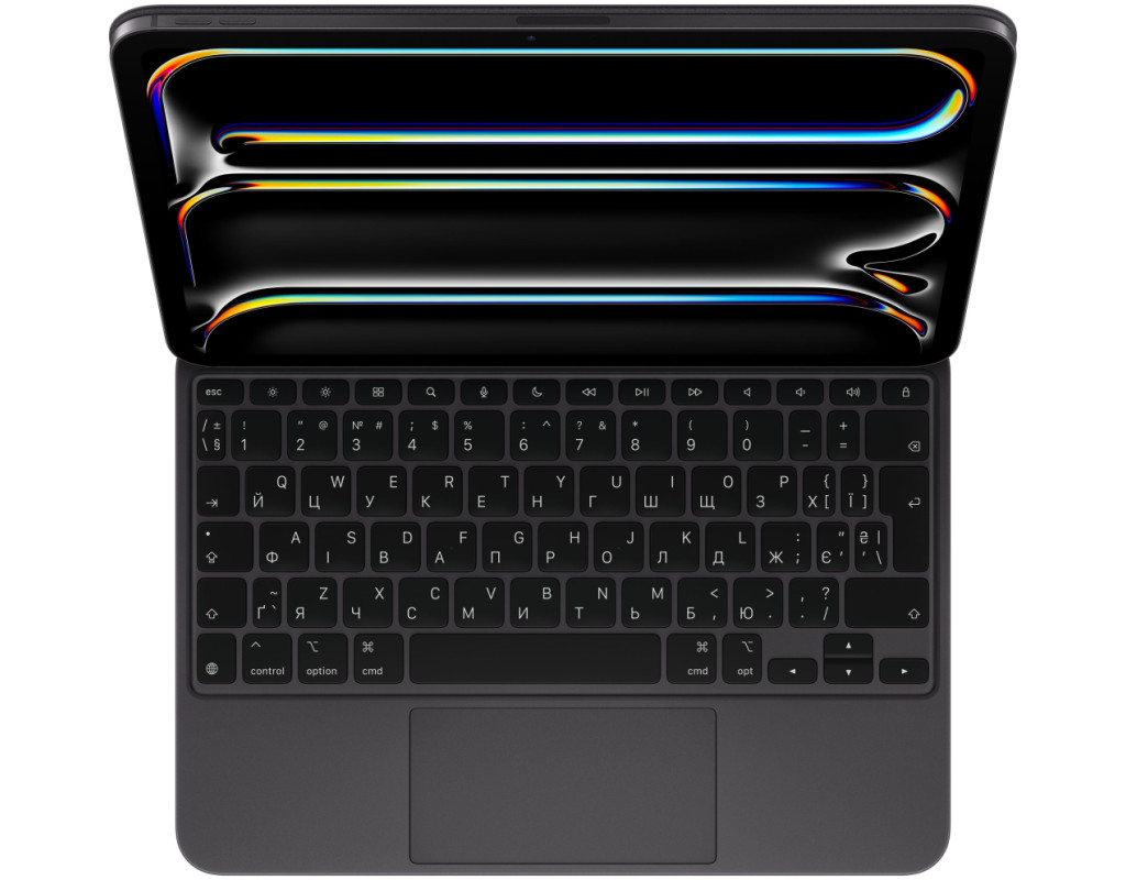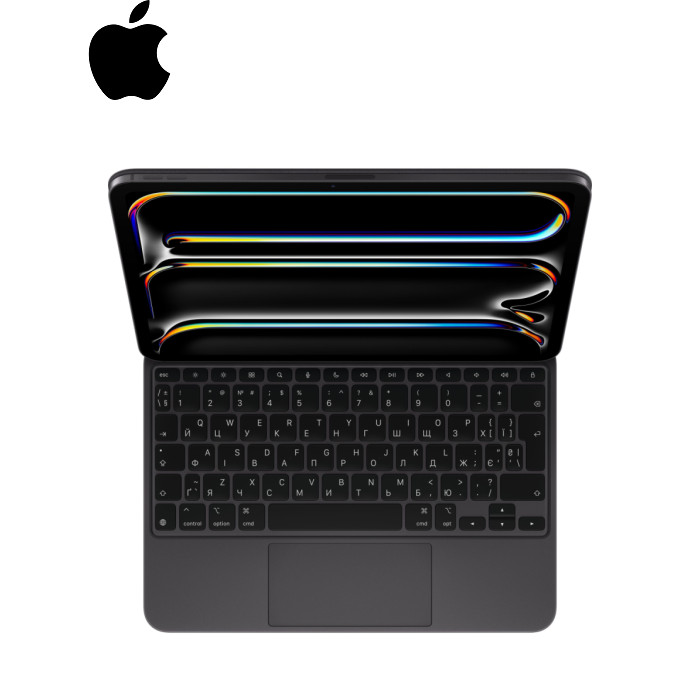 Клавіатура Magic Keyboard для iPad Pro - це чудовий набір тексту та трекпад у новому витонченому, портативному дизайні з алюмінієвою підставкою для долонь. Клавіатура має 14 функціональних клавіш для швидкого доступу до регулювання яскравості екрана, гучності та інших функцій, а також роз'єм USB-C для наскрізної зарядки. Плаваюча консольна конструкція плавно підлаштовується під різні кути огляду. Новий більший трекпад з тактильним зворотним зв'язком ідеально підходить для точних завдань, таких як редагування електронних таблиць і виділення тексту, або просто для навігації по iPad за допомогою інтуїтивно зрозумілих і звичних жестів Multi-Touch. Міцний зовнішній чохол забезпечує захист спереду і ззаду, ідеально підходить для того, щоб брати iPad Pro з собою куди завгодно. Особливості:
