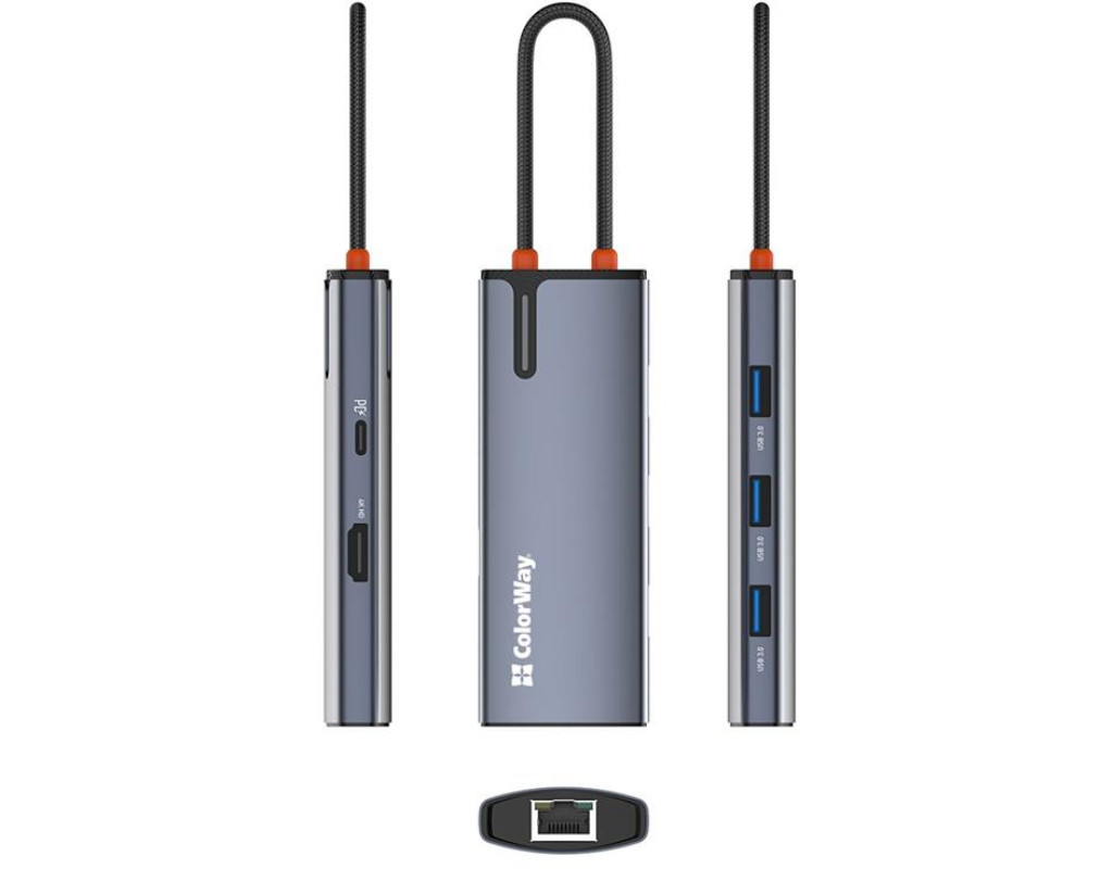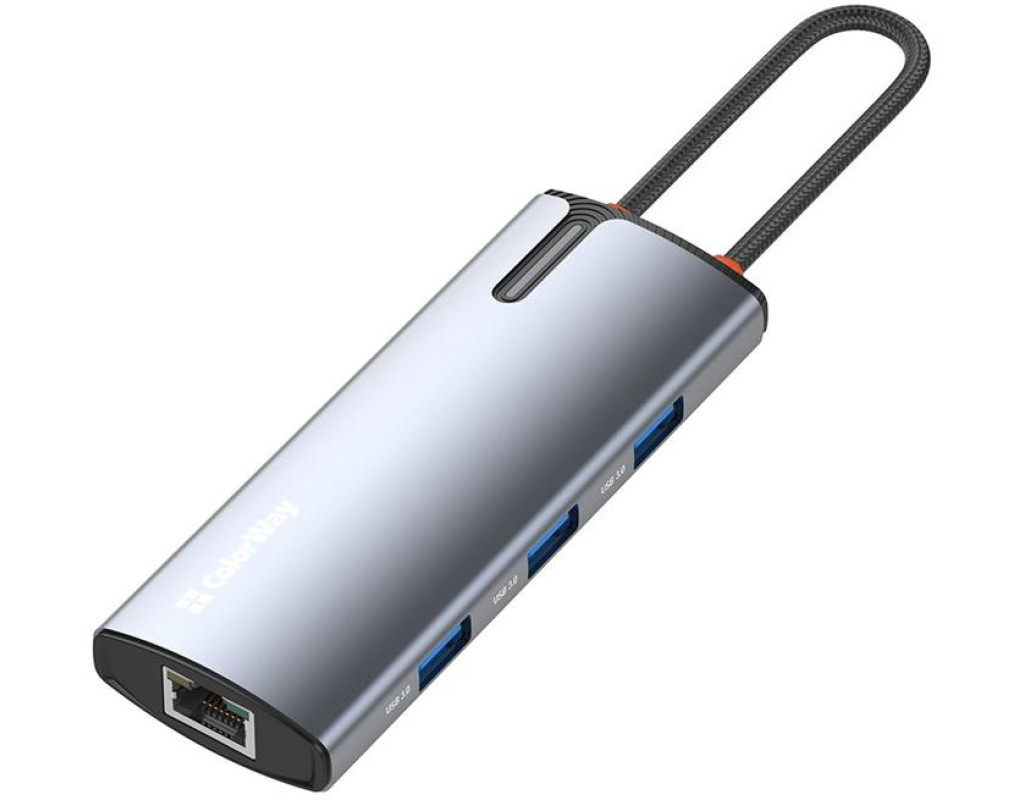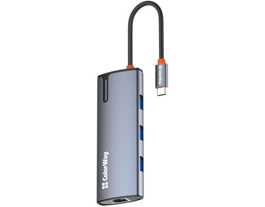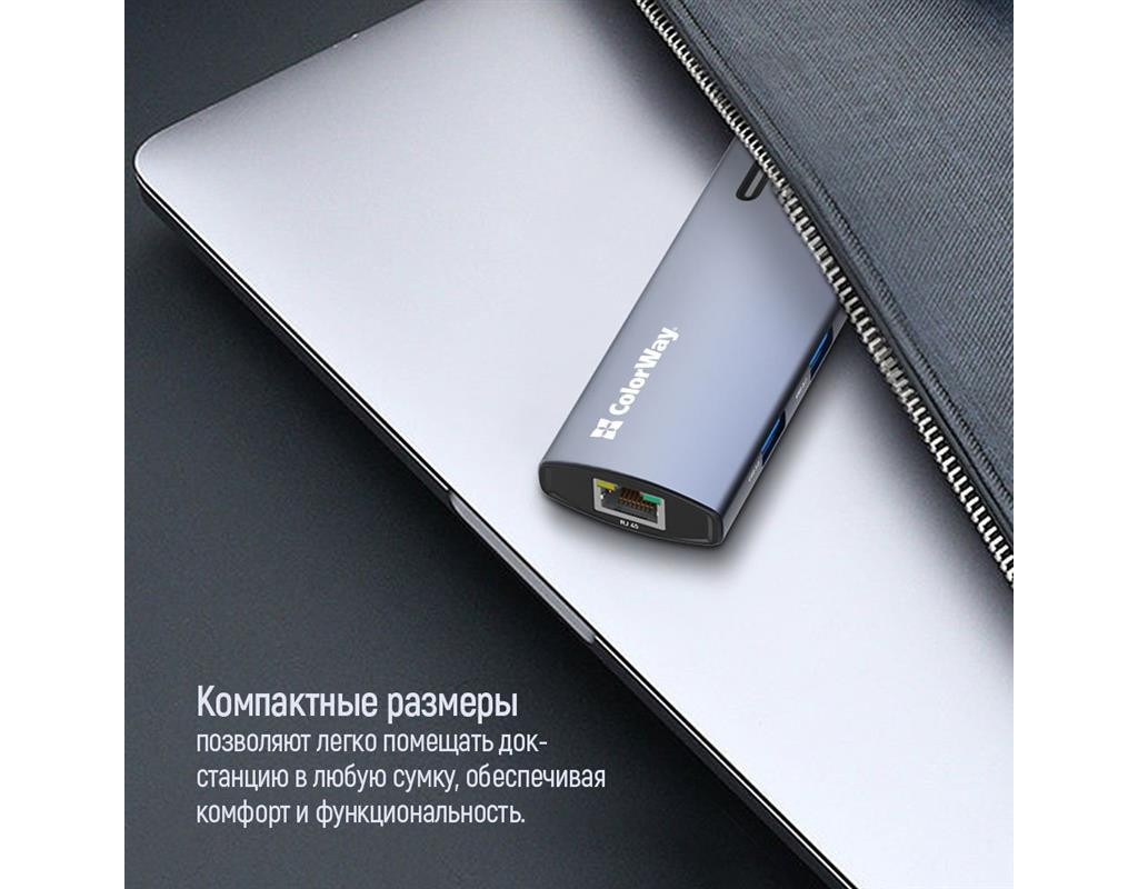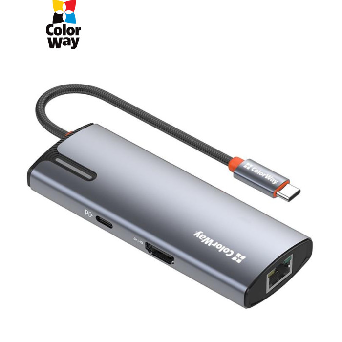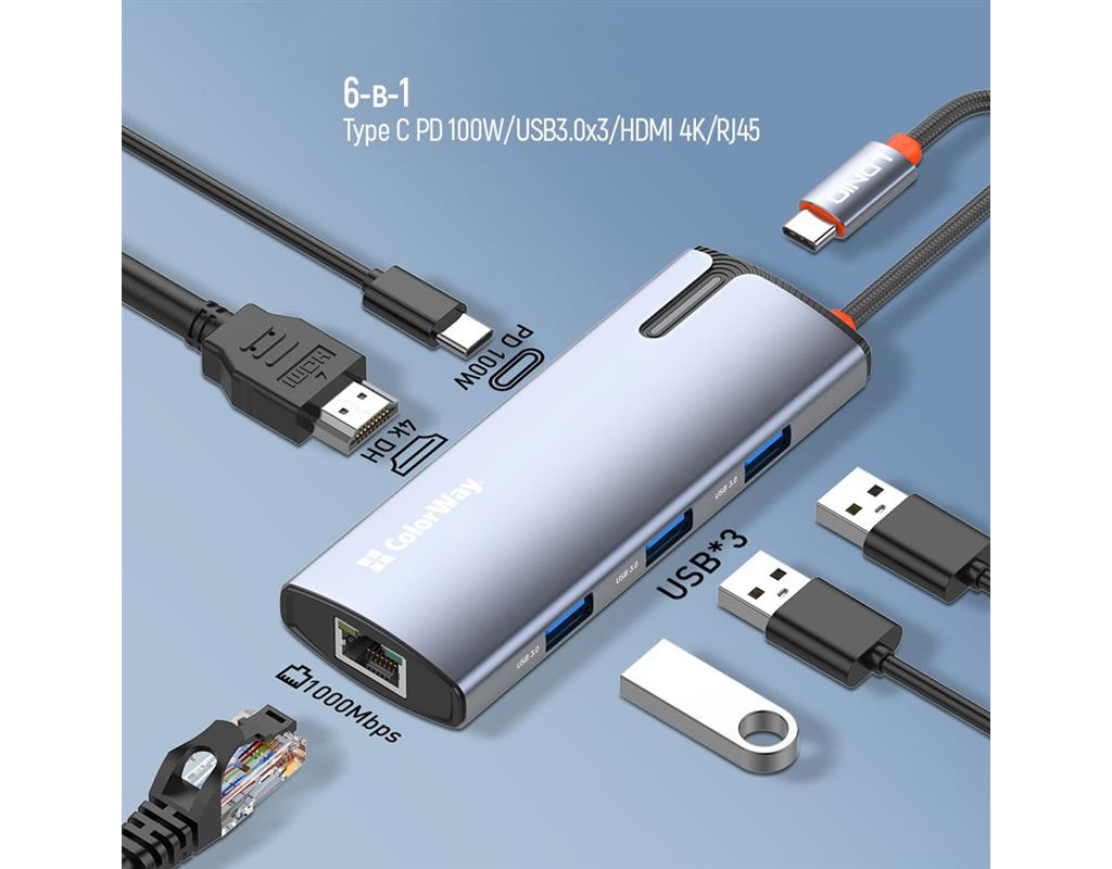 | USB хаб (док-станція) СolorWay USB-C 6-в-1 – це ідеальний вибір для тих, хто прагне максимально розширити функціональність свого ноутбука (планшета, смартфона, міні ПК тощо). Цей компактний та потужний пристрій додає шість додаткових портів, зробивши ваш ноутбук більш універсальним та зручним у використанні. Ви можете одночасно підключати всілякі пристрої, заряджати гаджети, виводити відео у форматі 4K та підключатися до мережі зі швидкістю 10/100/1000 Мбіт/с, що забезпечує стабільний та швидкий доступ до інтернету – все це за допомогою одного кабелю. Цей хаб ідеально підходить для користувачів, що часто працюють з великою кількістю периферійних пристроїв, а також домашнього використання, коли потрібні додаткові порти для підключення принтера, зовнішніх накопичувачів, смартфонів та інших гаджетів.