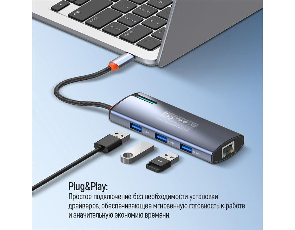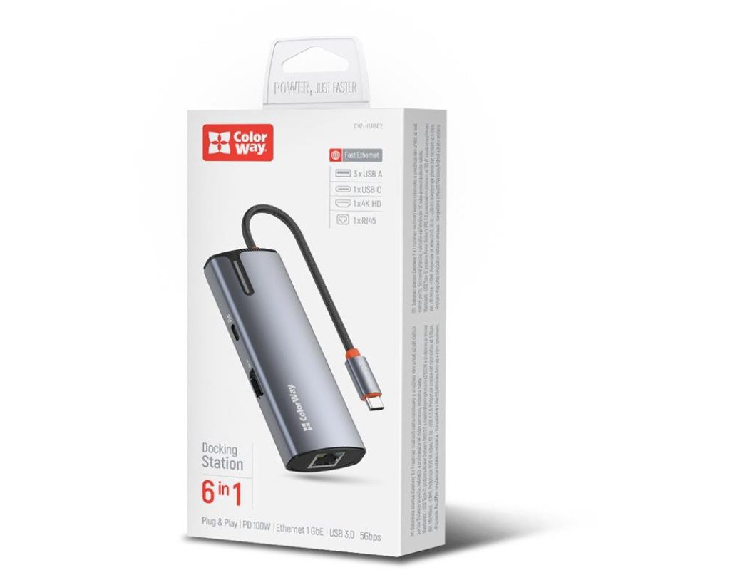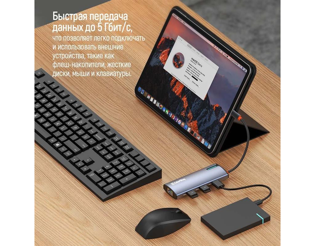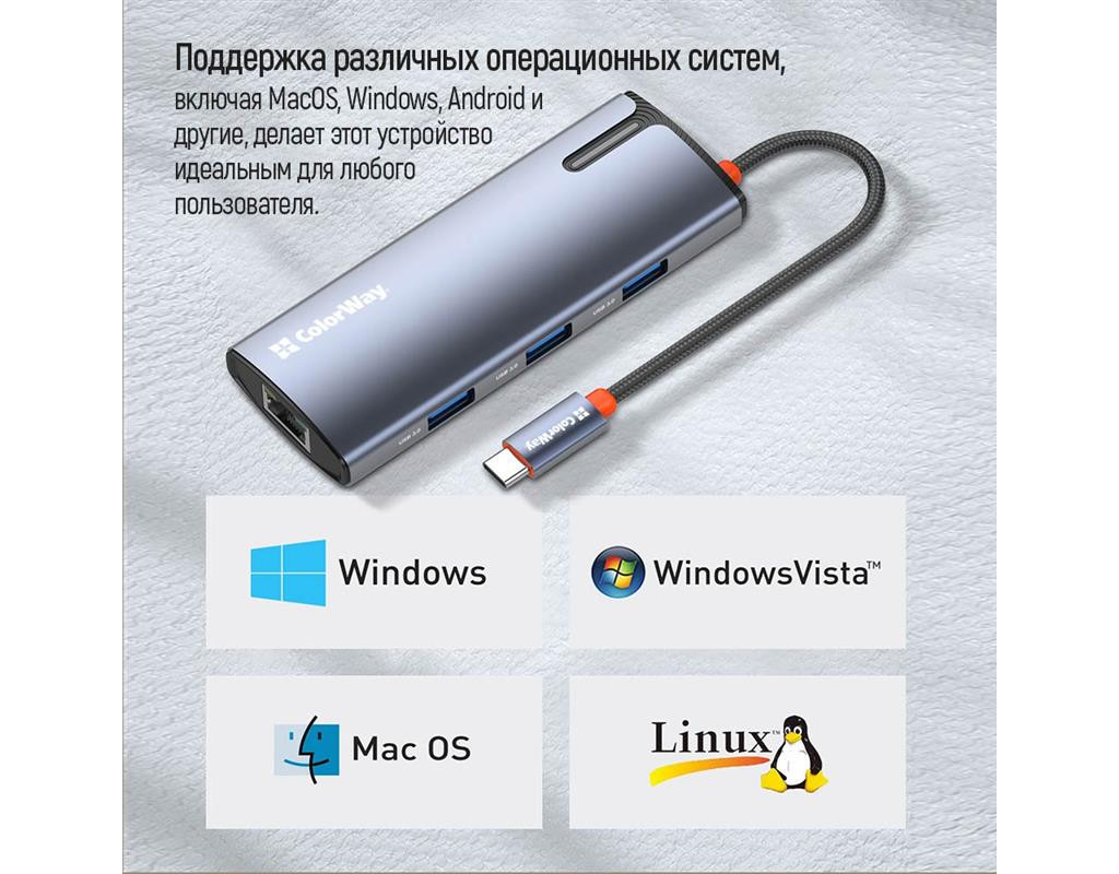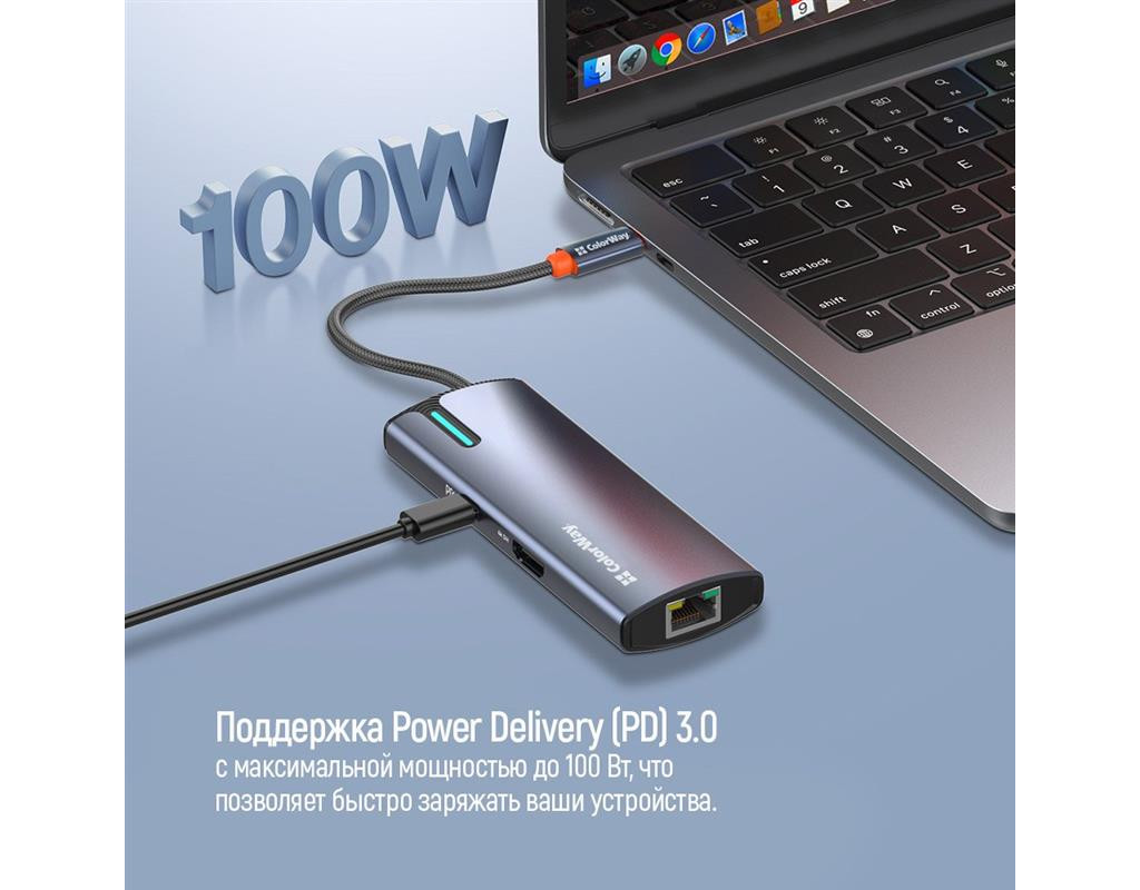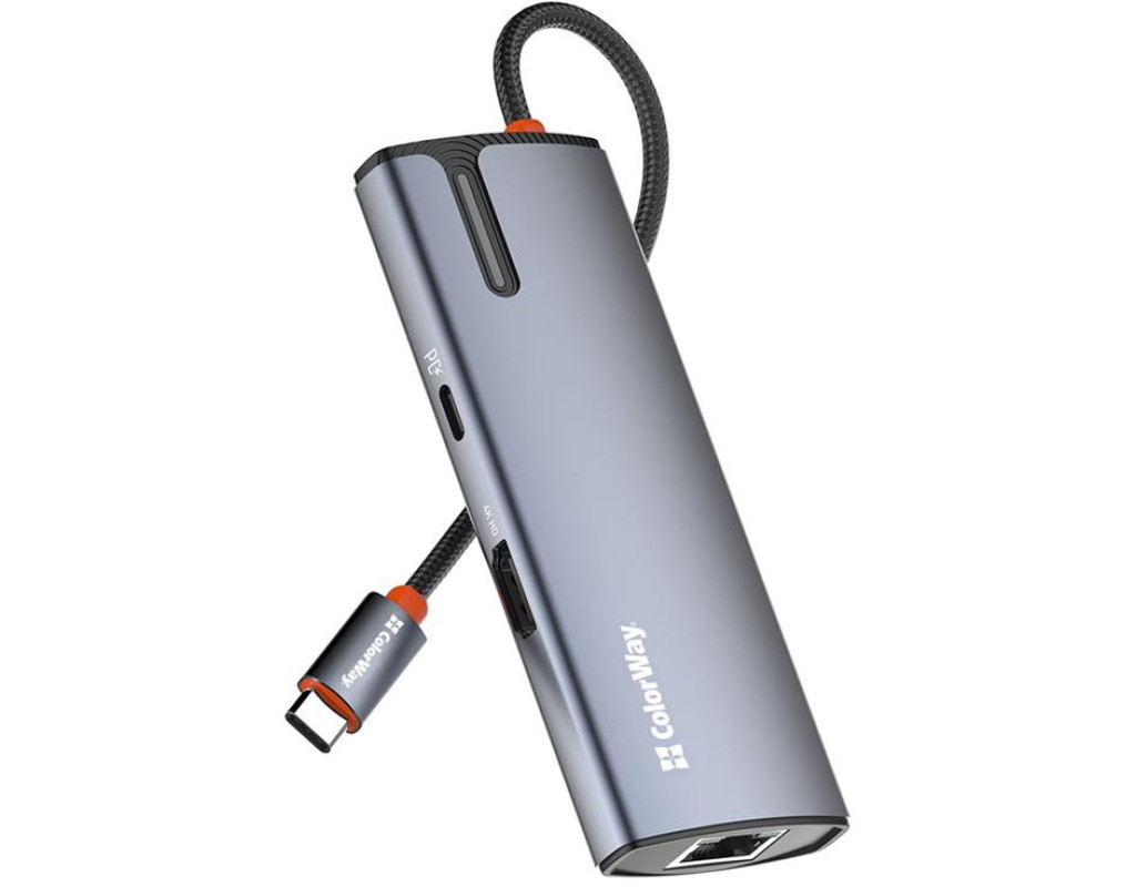 | USB хаб (док-станція) СolorWay USB-C 6-в-1 – це ідеальний вибір для тих, хто прагне максимально розширити функціональність свого ноутбука (планшета, смартфона, міні ПК тощо). Цей компактний та потужний пристрій додає шість додаткових портів, зробивши ваш ноутбук більш універсальним та зручним у використанні. Ви можете одночасно підключати всілякі пристрої, заряджати гаджети, виводити відео у форматі 4K та підключатися до мережі зі швидкістю 10/100/1000 Мбіт/с, що забезпечує стабільний та швидкий доступ до інтернету – все це за допомогою одного кабелю. Цей хаб ідеально підходить для користувачів, що часто працюють з великою кількістю периферійних пристроїв, а також домашнього використання, коли потрібні додаткові порти для підключення принтера, зовнішніх накопичувачів, смартфонів та інших гаджетів.