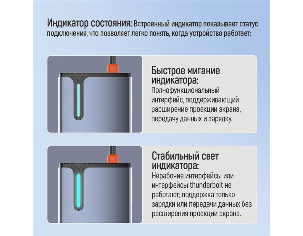 Увага! Док-станція, що має виходи HDMI, Type-C PD 100W, має працювати з більшістю девайсів (ноутбуки, смартфони, планшети), що мають порт Type-C. Однак є кілька моментів, на які варто звернути увагу: Підтримка стандартів: Не всі порти Type-C на девайсах підтримують однакові функції. Деякі порти Type-C можуть підтримувати лише передачу даних, інші можуть підтримувати відео (через режим Alternate Mode) або лише зарядку (Power Delivery). Для повноцінної роботи док-станції ваш девайс повинен підтримувати ці функції. Підтримка Power Delivery (PD): Якщо ви плануєте використовувати док-станцію для заряджання через Type-C, переконайтеся, що ваш девайс підтримує Power Delivery. Крім того, переконайтеся, що максимальна потужність зарядки, що підтримується ваш девайс, сумісна з док-станцією (в даному випадку не більше 100W). Підтримка відеовиходу: Для підключення зовнішніх дисплеїв через HDMI ваш девайс повинен підтримувати режим Alternate Mode на порту Type-C. Індикатор стану: Вбудований індикатор показує статус підключення, що дозволяє легко зрозуміти, коли пристрій працює. Швидке миготіння індикатора: Повнофункціональний інтерфейс, який підтримує розширення проекції екрана, передачу даних та заряджання. Стабільне світло індикатора: Нефункціональні інтерфейси або thunderbolt інтерфейси не працюють; підтримка лише заряджання або передачі даних без розширення проекції екрана. |