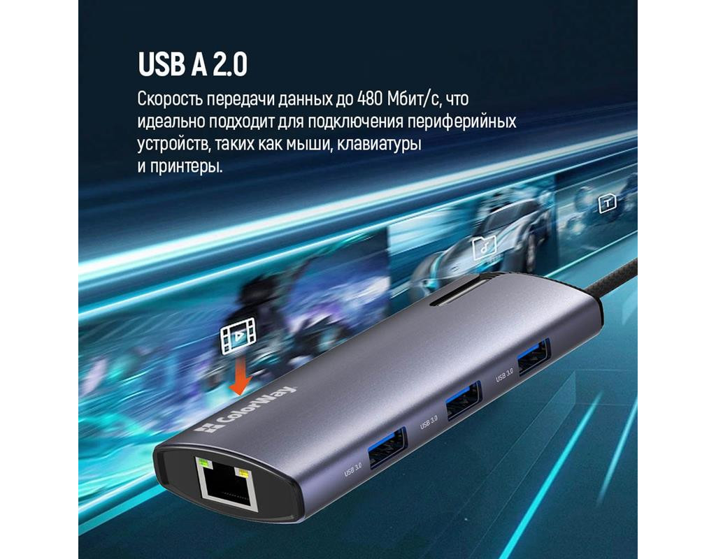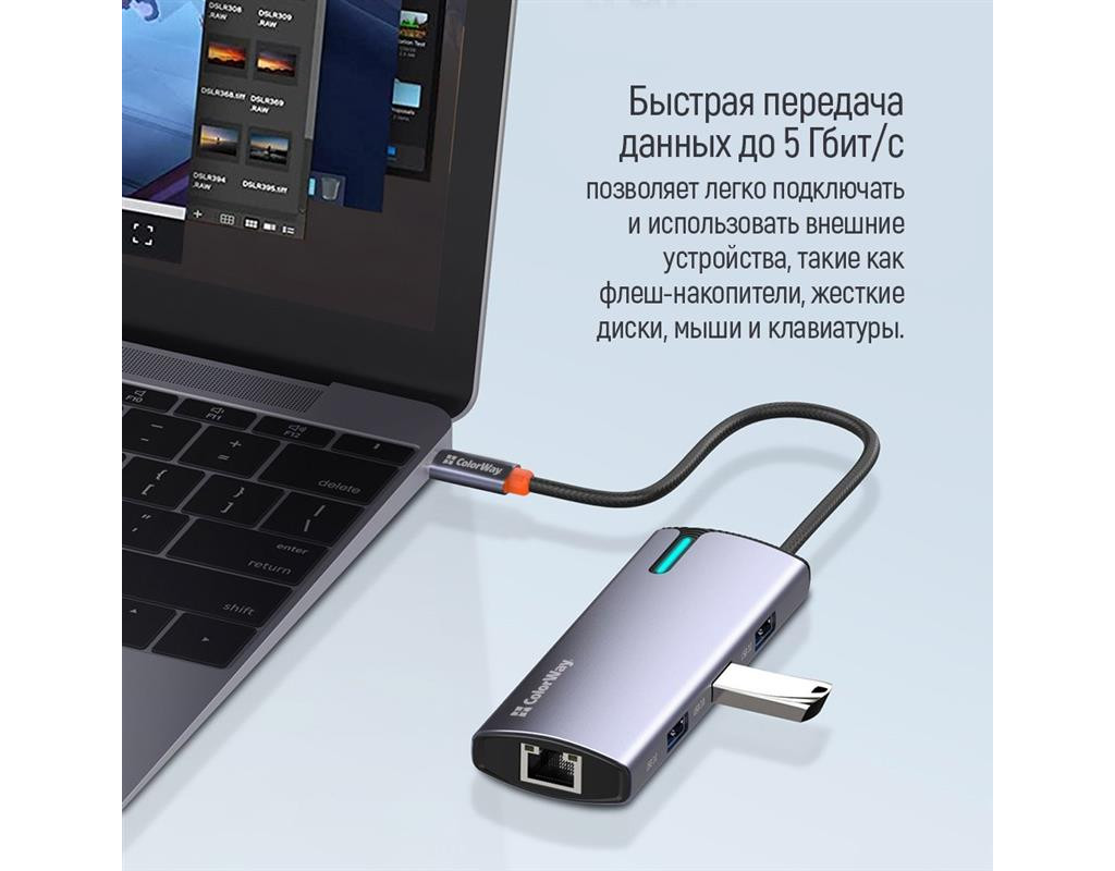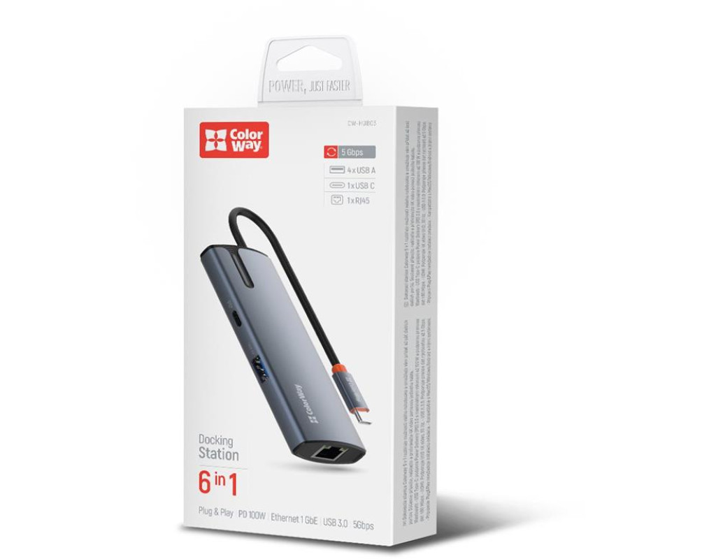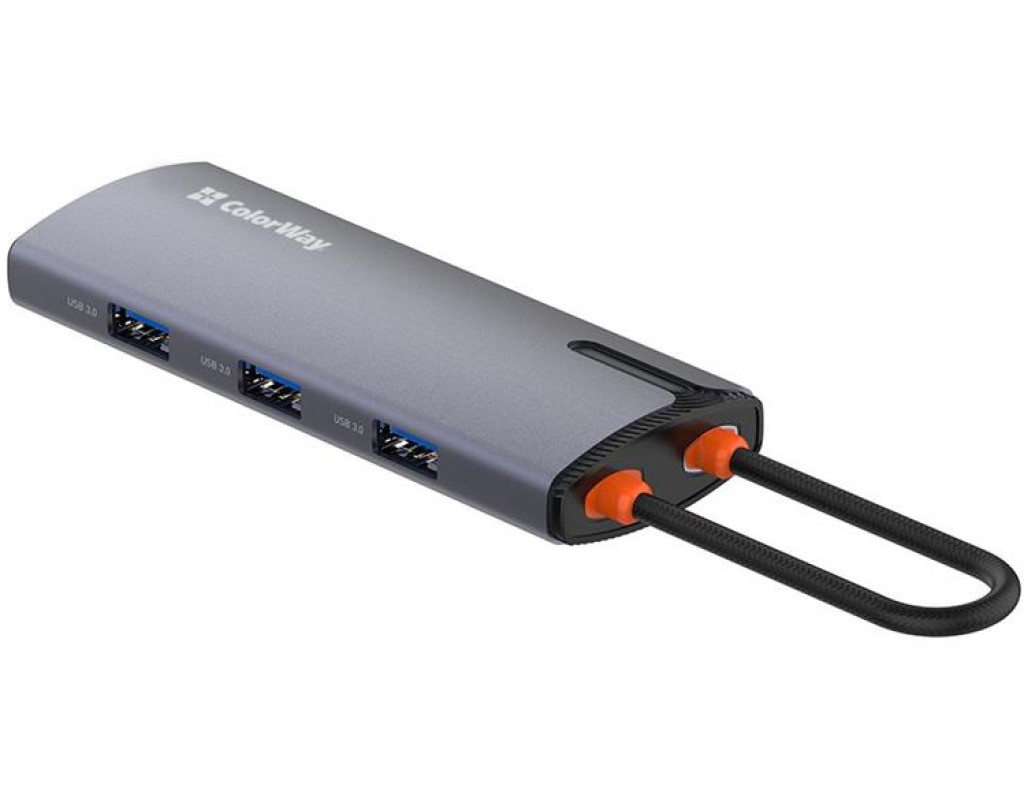 | USB хаб (док-станція) СolorWay USB-C 6-в-1 – це ідеальний вибір для тих, хто прагне максимально розширити функціональність свого ноутбука (планшета, смартфона, міні ПК тощо). Цей компактний та потужний пристрій додає шість додаткових портів, зробивши ваш ноутбук більш універсальним та зручним у використанні. Ви можете одночасно підключати всілякі пристрої, заряджати гаджети та підключатися до мережі зі швидкістю 10/100/1000 Мбіт/с, що забезпечує стабільний та швидкий доступ до інтернету – все це за допомогою одного кабелю. Цей хаб ідеально підходить для користувачів, що часто працюють з великою кількістю периферійних пристроїв, а також домашнього використання, коли потрібні додаткові порти для підключення принтера, зовнішніх накопичувачів, смартфонів та інших гаджетів.