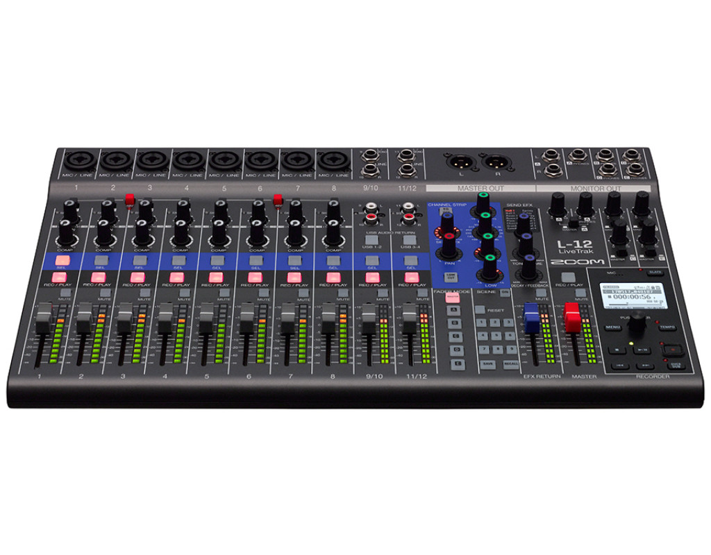 Zoom LiveTrak L-12 - багатофункціональна цифрова консоль для мікшування, звукозапису, моніторингу, відтворення і ремікшування. LiveTrak дасть вам змогу записувати аудіо на 12 дискретних доріжок у якості до 24 біт/96 кГц WAV на SD-карту й одночасно мікшувати ваш живий виступ. Доріжки записуються без застосування еквалайзера та ефектів, тож ви зможете перенести їх на вашу віртуальну студію звукозапису (DAW) для подальшого мікшування і монтажу. Кожен з п'яти моніторних виходів LiveTrak дає змогу створити унікальний мікс, завдяки чому кожен виконавець може створити і зберегти мікс, створений відповідно до своїх особистих уподобань. Комплект поставки: - Мережевий адаптер (AD-19)