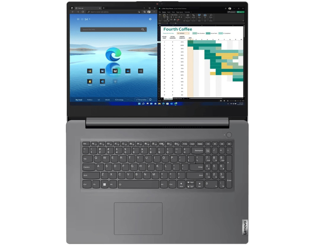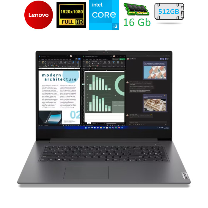 Продуктивний бізнес-ноутбук із великим екраном Насолоджуйся роботою ноутбука Lenovo V17 G4 IRU, створеного для ефективного виконання бізнес-завдань. Пристрій у пластиковому корпусі оснащений процесором Intel Core, інтегрованим відеочіпом Intel, а також дисплеєм діагоналлю 17.3 дюйми. Тобі вистачить простору для роботи. Це стосується не лише екрана, а й клавіатури з окремим блоком цифрових кнопок. Попри це, пристрій залишається портативним.