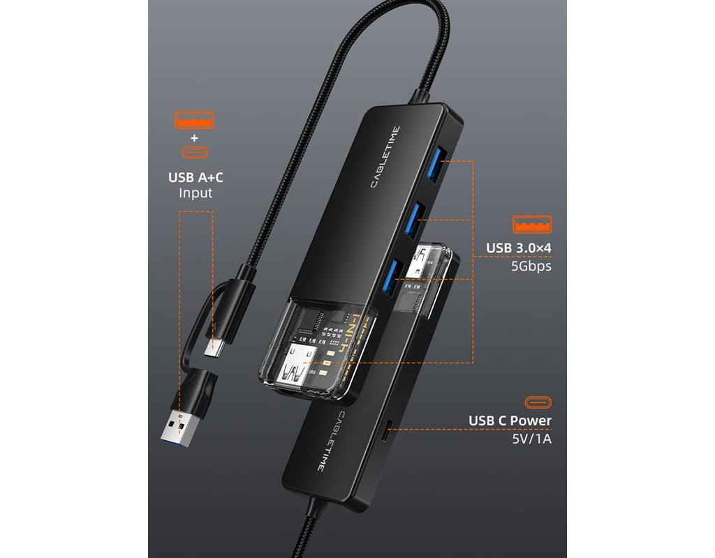 | USB-хаб Cabletime USB С/A - 4 Port USB 3.0, 5Gbps, 0.15 cm (CB05B) забезпечує максимальну швидкість передачі даних до 5 Гбіт/с, дозволяючи підключати кілька USB-пристроїв, таких як клавіатури, миші або портативні пристрої зберігання даних.