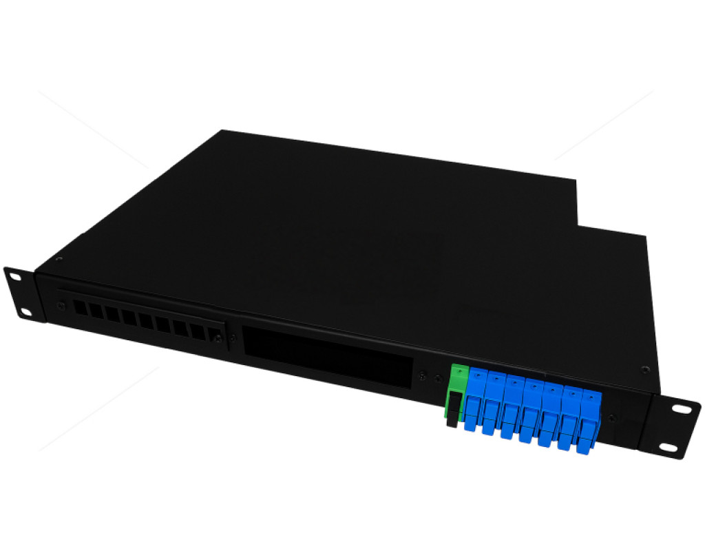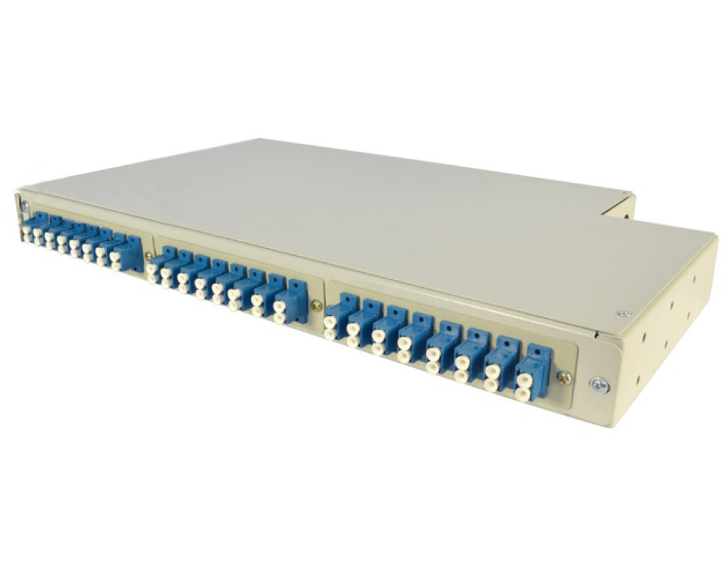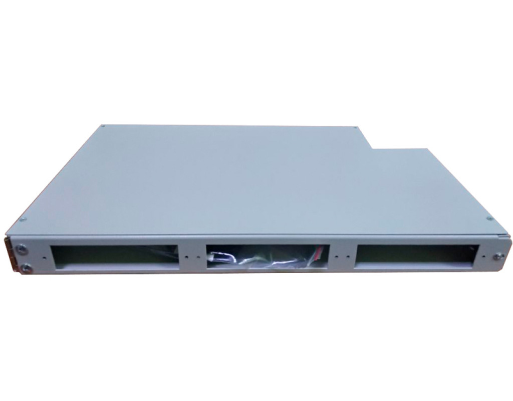 Крім того, розміри вікон в передній частині панелі адаптовані під можливість встановлення дуплексних SC адаптерів без лицьових панелей. Така можливість дозволяє при необхідності істотного ущільнення розміщення оптичних портів в конструктиві висотою 1U розмістити максимально 66 SC оптичних портів. |