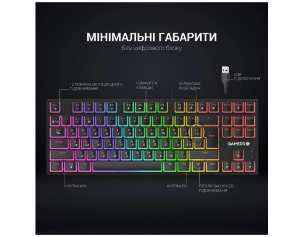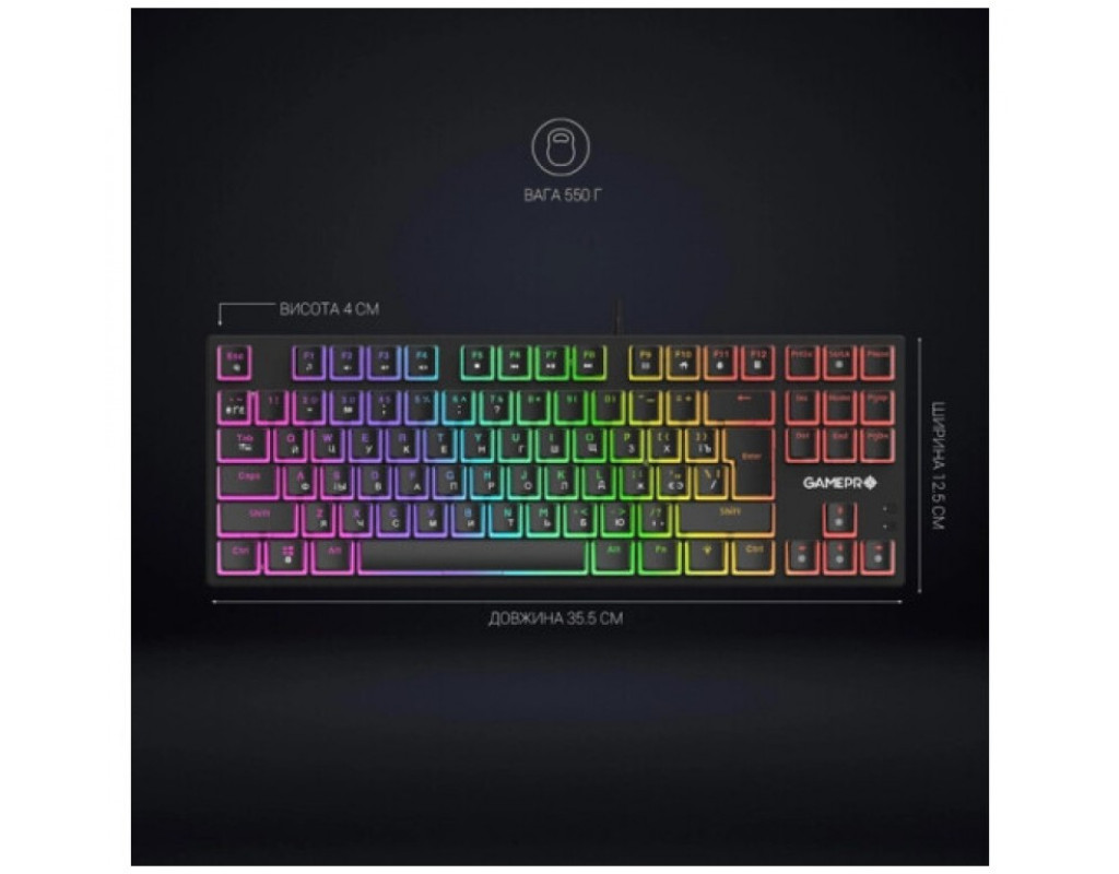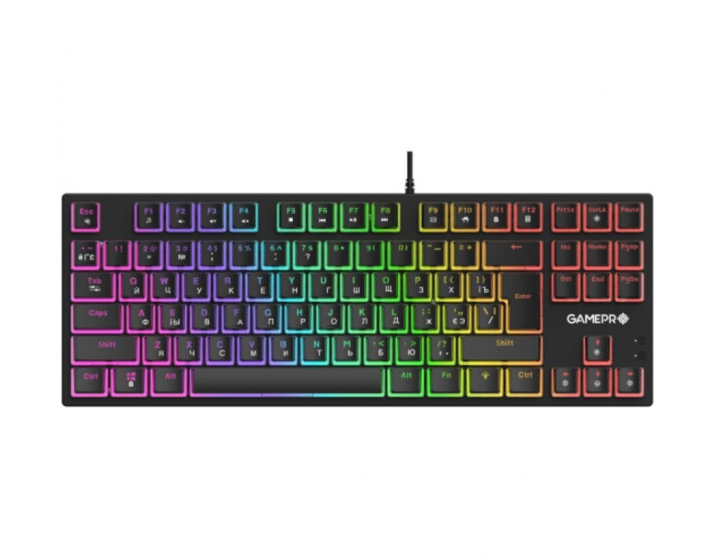 GamePro MK80 — механічна ігрова клавіатура. Вона має стильний лаконічний дизайн, який доповнює яскрава підсвітка. Таке виконання дозволить створити особливу атмосферу під час найзапекліших поєдинків. Клавіатура має 87 клавіш з мультимедійними функціями. Її можна використовувати не лише під час ігрового процесу, але й для роботи чи навчання, адже клацання не заважатиме вашим сусідам у гуртожитку чи колегам в офісі. Пристрій під'єднується до ПК за допомогою популярного інтерфейсу USB 2.0 без встановлення додаткових драйверів. Завдяки технології Plug and Play ви можете насолоджуватися своєю роботою за клавіатурою, не втрачаючи часу на підключення. Ресурс натискання клавіш: 20 млн натискань. |
