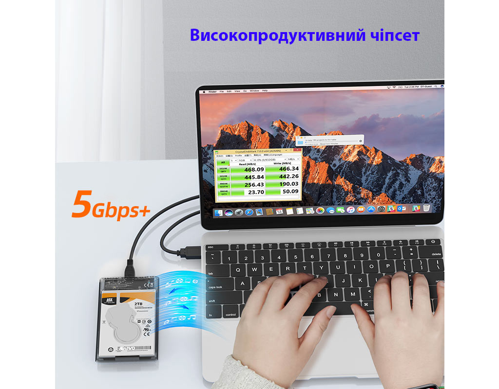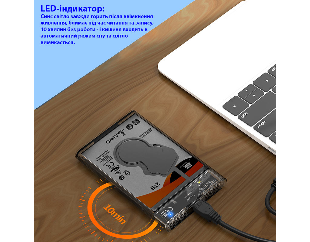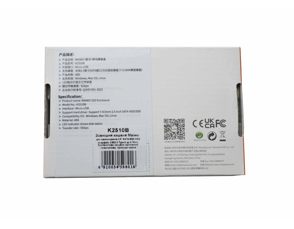 Прозора зовнішня кишеня Maiwo K2510B темного кольору для 2,5-дюймових дисків SATAI/II/III HDD або SSD з кабелем підключення USB 3.0 Type-A - ідеальне рішення для розширення можливостей зберігання даних вашого комп'ютера або ноутбука. Цей корпус легко перетворює 2,5-дюймовий HDD SATA або SSD на портативний зовнішній накопичувач з високою швидкістю передачі даних до 5 Гбіт/с через USB 3.0. Зовнішня кишеня K2510B сумісна з будь-якими 2.5-дюймовими накопичувачами SATAI/II/III товщиною від 7 до 9.5 мм. За допомогою цієї кишені для жорсткого диска ви зможете подарувати нове життя вашим старим накопичувачам, використовувати їх як зовнішні сховищ даних для фотографій, музики, відеозаписів тощо, таким чином зберегти свої цінні спогади. Завдяки простій конструкції зовнішньої кишені та безгвинтовому засувному механізму кріплення жорсткого диска в кишені, для підключення накопичувачів вам не знадобляться інструменти. Кишеня підтримує протокол U.A.S.P., завдяки якому він працює на 20% швидше при копіюванні великих масивів даних і менше навантажує процесор ПК. Підтримуються функції Plug and Play та Hot-Plug, не потребує встановлення драйверів. Дозволяє швидко і надійно підключити кишеню з жорстким диском до комп'ютера, що працює, при цьому немає необхідності перезавантажувати комп'ютер. Зовнішню кишеню сумісний з більшістю популярних операційних систем: Windows XP, Vista, 7, 8, 8.1, 10, 11, Android, Mac OS та вище. Характеристики: