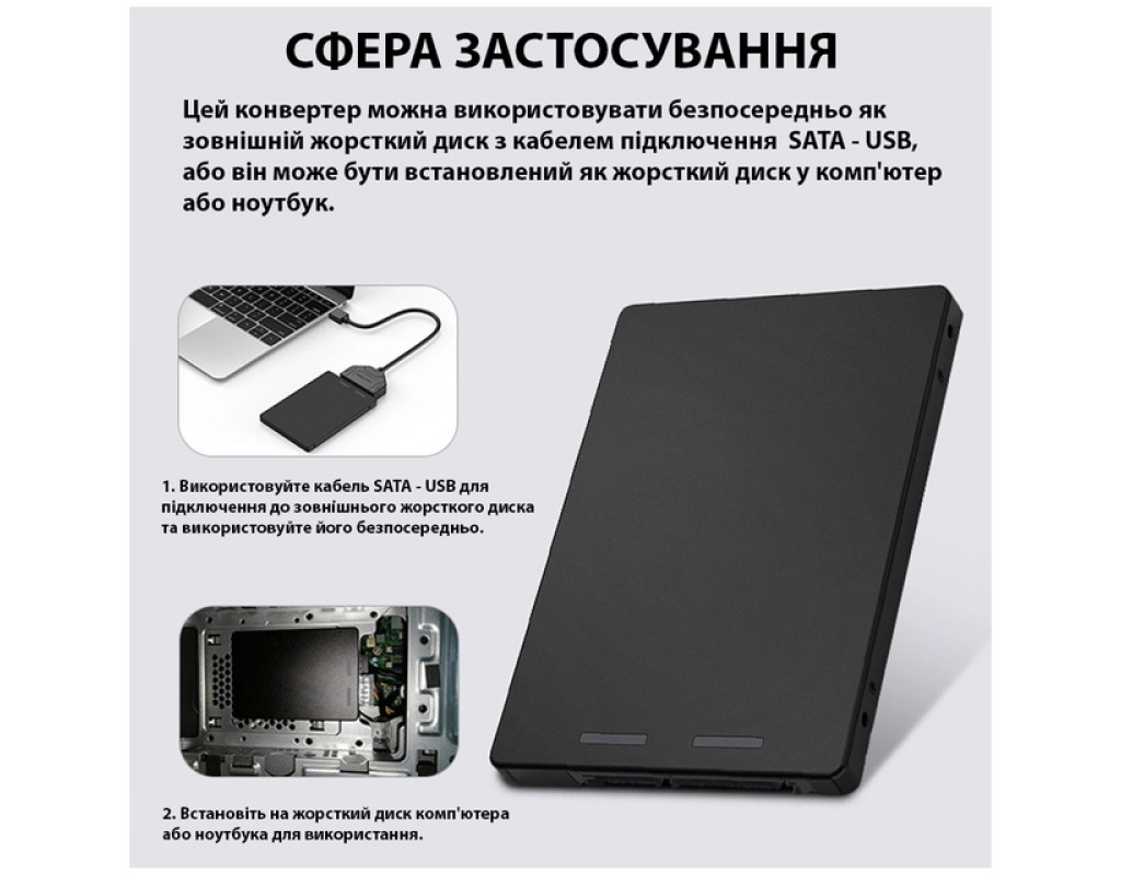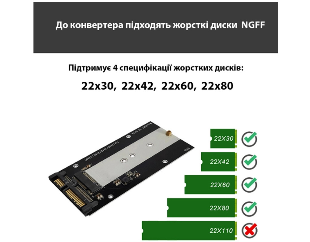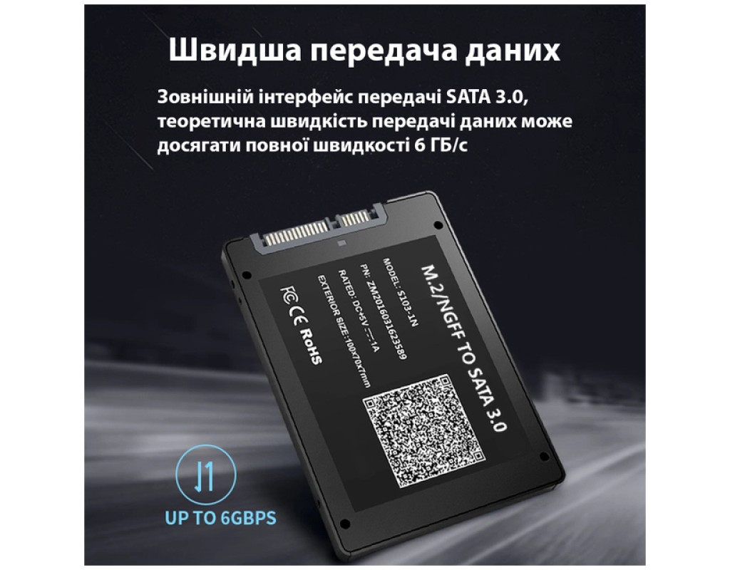 Конвертер Dynamode S103-1N призначений для встановлення M.2 (NGFF) SSD в ноутбук або комп'ютер замість 2.5" SATA. Таким чином, він конвертує M.2 (NGFF) SSD у стандартний диск 2.5" SATA III. У накопичувача M.2 SSD швидкість обміну даними набагато вища, ніж у звичайного 2.5" HDD SATA, і, що дуже важливо, він удароміцний. Тому якщо раптом ваш ноутбук впаде, то його слабке місце — жорсткий диск — залишиться в цілісності та збереженні.Установка