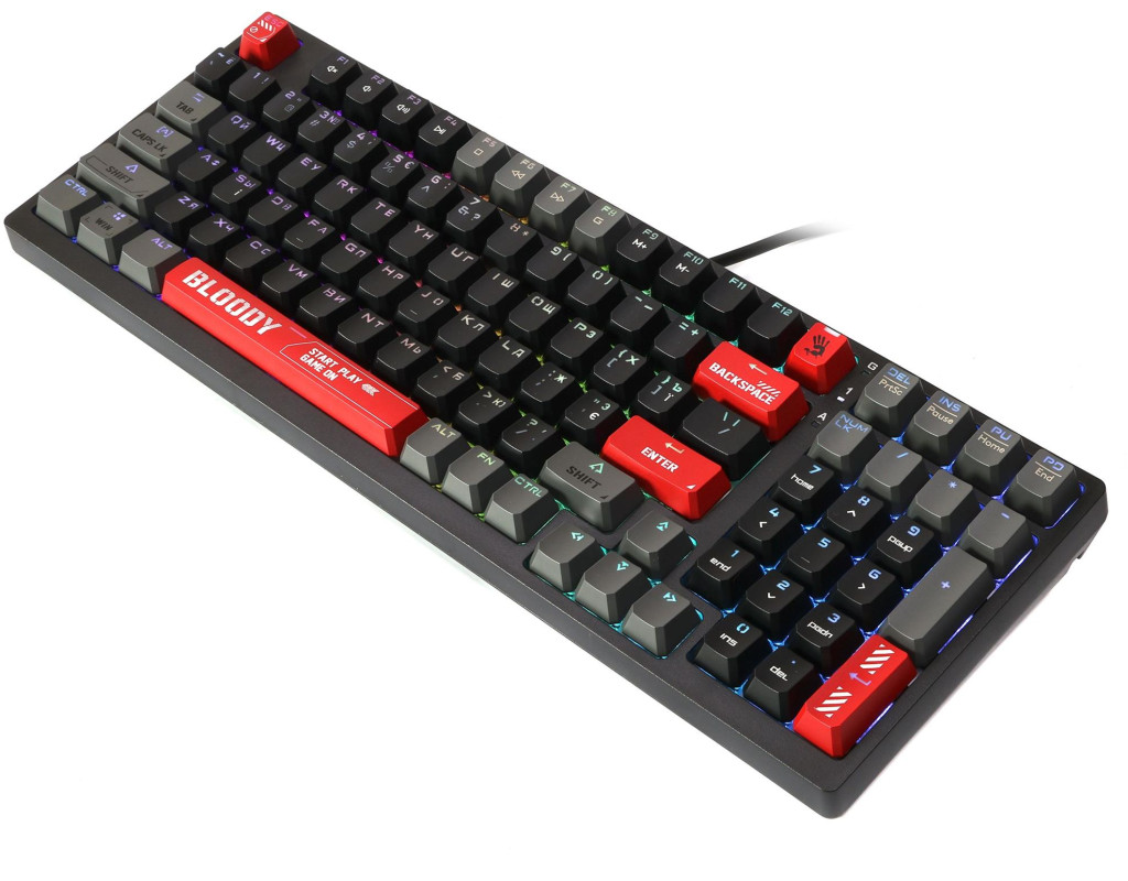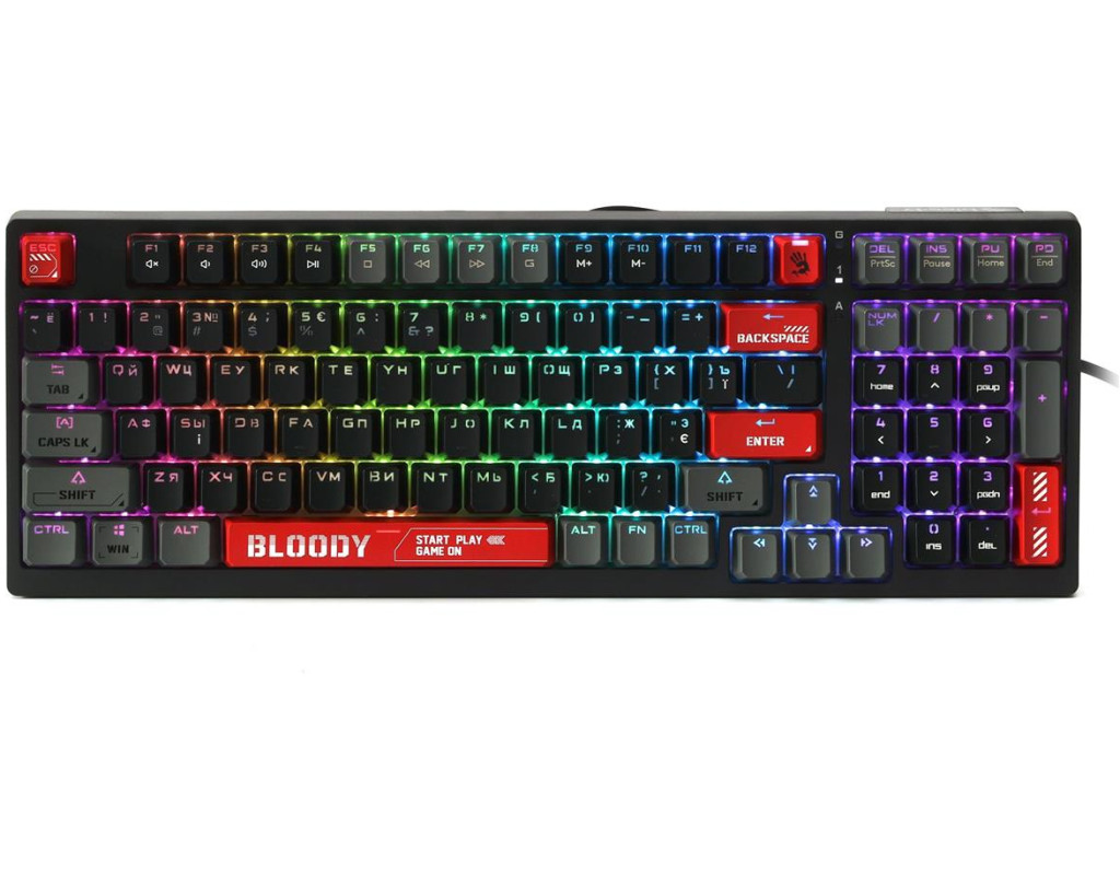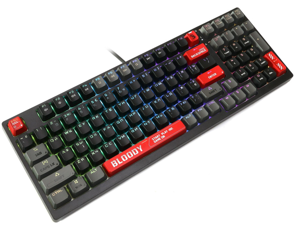 Особливості Механічні перемикачі Bloody BLMS. Спеціальне налаштування точки та сили спрацьовування забезпечує вражаючі швидкість та відчуття під час гри! З можливістю гарячої заміни. Сумісна з 3-контактними та 5-контактними механічними перемикачами. Надзвичайно тихий набір тексту. Силіконові накладки зменшують шум, що виникає під час набору тексту. 24 ігрових PBT кейкапів. Ковпачки "ігрових" клавіш виготовлені з PBT-пластику для збільшення їхньої довговічності. PBT-кейкапи Bloody мають ідеально розраховану вагу, що забезпечує своєчасний відгук при натисканні. 98-клавішна клавіатура. Компактний 2-зонний дизайн забезпечує функціональність, еквівалентну повнорозмірній клавіатурі, при мінімальному використанні простору. Прокладання кабелів у 3 напрямках. Клавіатура поставляється з інтерфейсом Type-C з 3-направленим укладанням для кращого управління кабелями. Дві регульовані ніжки. Ніжки клавіатури мають два рівні налаштування для кращої оптимізації роботи під поточні завдання. RGB-підсвічування. Вільно налаштовуйте кольори, створюючи свій власний унікальний RGB "Self-Customize". За замовчуванням 10 ефектів підсвічування. Налаштуйте ефекти підсвічування, натискаючи клавіші "FN" з клавішами "FN+0 ~9". Зберігання 7 ігрових режимів. Натисніть Fn + F9/F10, щоб переключити 7 ігрових режимів. 4 Мб вбудованої пам’яті. Програмована пам’ять, що здатна зберігати до 7 профілів налаштувань без використання ПЗ. |