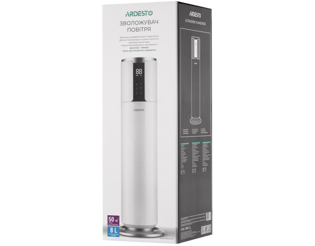 | Ультразвуковий зволожувач повітря з LED-дисплеєм, пультом ДК, таймером і датчиком рівня вологості. Має три рівні зволоження: мінімальний, середній і максимальний. Об’єм резервуара великий – 8 л. Передбачено автоматичне вимкнення, коли резервуар стане порожнім. Зволожувач працює безшумно, завдяки чому його можна використовувати під час сну. Пристрій має ергономічну конструкцію та верхнє заливання води. |