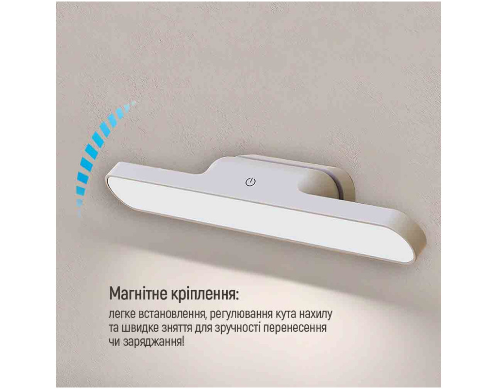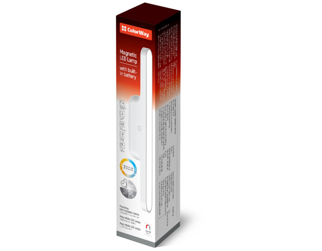 Світлодіодна лампа ColorWay з акумулятором оснащена магнітним кріпленням, що робить її надзвичайно зручною у використанні. Це кріплення дозволяє швидко і легко встановлювати лампу в будь-якому місці та регулювати її кут нахилу для досягнення оптимального освітлення. Магнітне кріплення забезпечує надійну фіксацію та легкість у демонтажу для перенесення або заряджання без використання інструментів. Акумулятор ємністю 1800 мАг забезпечує до 10 годин безперервної роботи. Три температурні режими світла та плавне регулювання яскравості дозволяють налаштувати освітлення відповідно до ваших потреб. Пам'ять налаштувань яскравості і сенсорна кнопка для безшумного управління забезпечують додаткову зручність у користуванні. Особливості