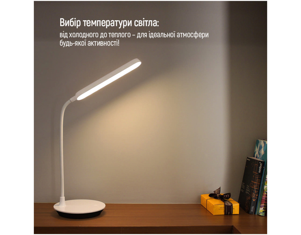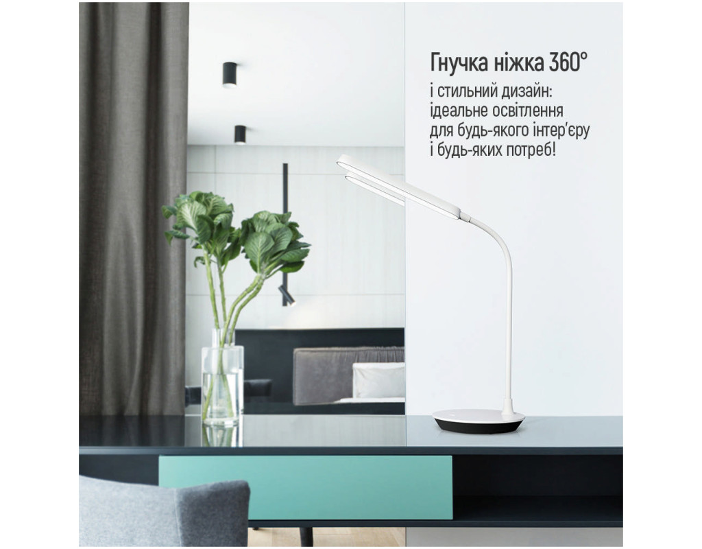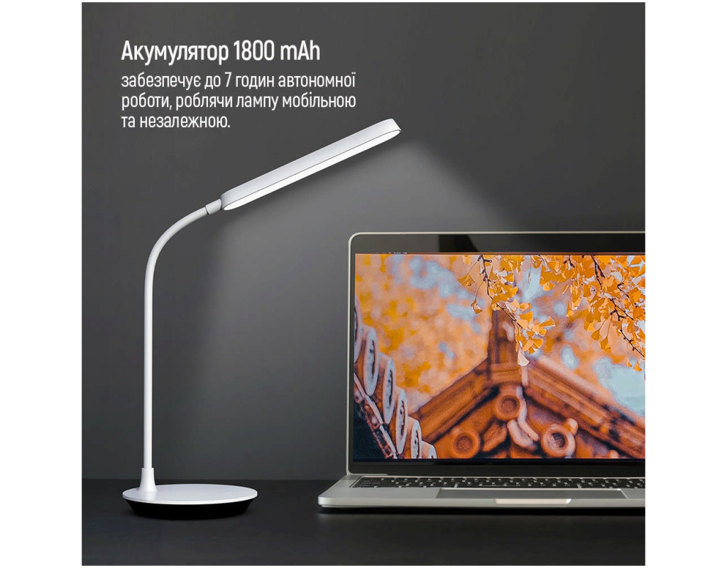 Час роботи 3.5-7 годин. Ємність акумулятора: 1800 mAh Вага 495 грам. Гнучка ніжка 360° та стильний дизайн роблять лампу ідеальним елементом інтер’єру, а також дозволяють підлаштовувати освітлення під будь-які потреби. Вбудований потужний акумулятор об’ємом 1800 mAh забезпечує до 7 годин автономної роботи, що робить лампу мобільною та незалежною від джерела живлення. Зручна зарядка через роз’єм USB дозволяє підключати та заряджати лампу від будь-якого пристрою з USB-портом, такого як комп’ютер, ноутбук чи PowerBank. Сенсорна кнопка для безшумного управління яскравістю та температурою світла, що дозволяє користувачам підлаштовувати освітлення під свої потреби. Можливість вибору різних температур світла - від холодного до теплого, для створення комфортної атмосфери для роботи, читання або відпочинку. Мінімальна яскравість для використання як нічника, що робить лампу універсальним освітлювальним засобом. Пам'ять налаштувань яскравості: Зберігає налаштований рівень яскравості для кожної температури кольору, що дозволяє швидко переключатися між різними налаштуваннями з урахуванням вашого комфорту. 36 світлодіодів забезпечують рівномірне розсіювання світла без відблисків і мерехтіння, що забезпечує комфортне освітлення для очей під час тривалого користування та запобігає втомі від штучного світла. Високий індекс відтворення кольорів >RA80 для точного відображення кольорів, що робить лампу ідеальним рішенням для детальних робіт.